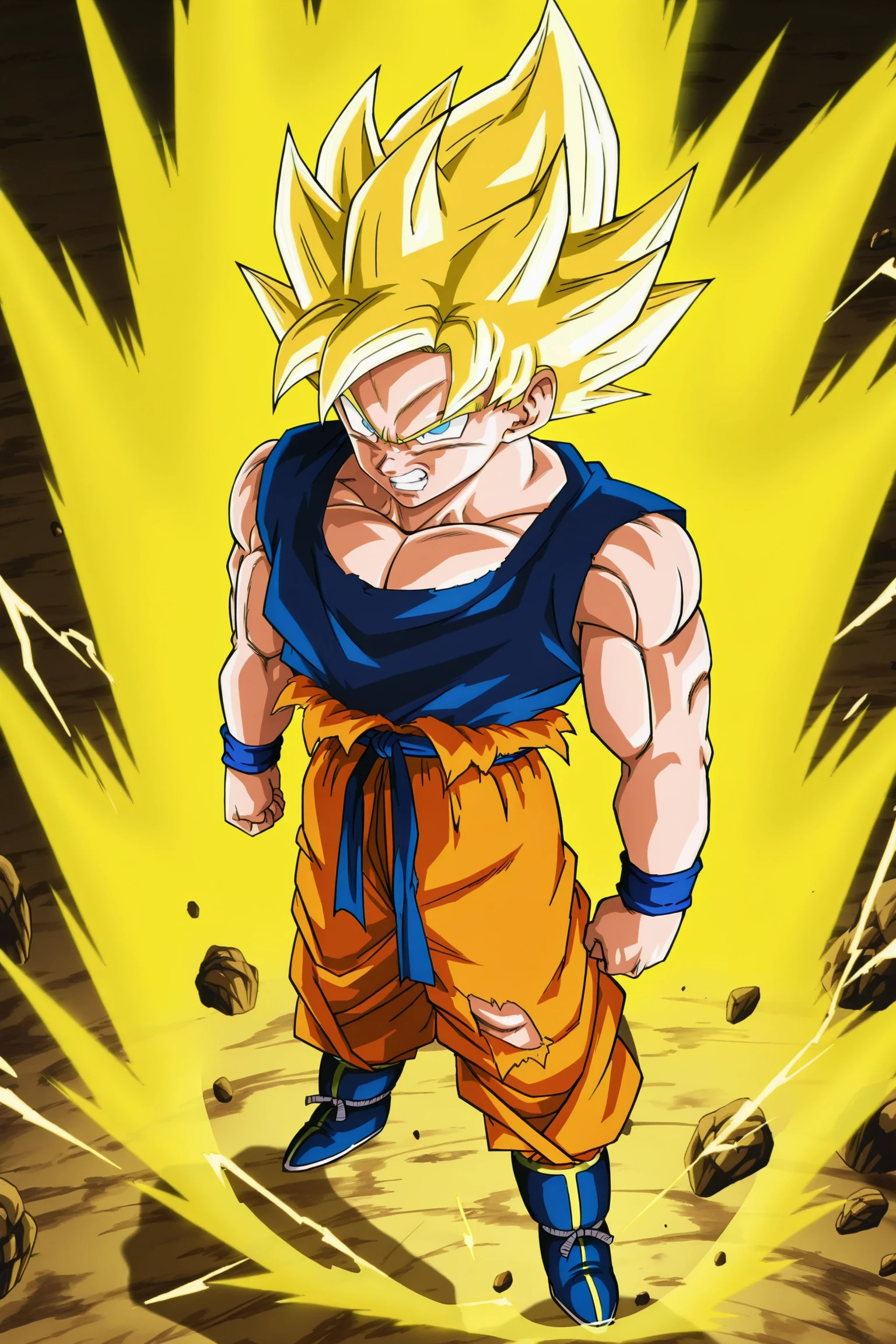 clothes writing, blue footwear, dougi, monkey tail, white legwear, symbol, orange pants, orange topwear, print topwear, blue wristband, blue sash, sleeveless, socks, shoes