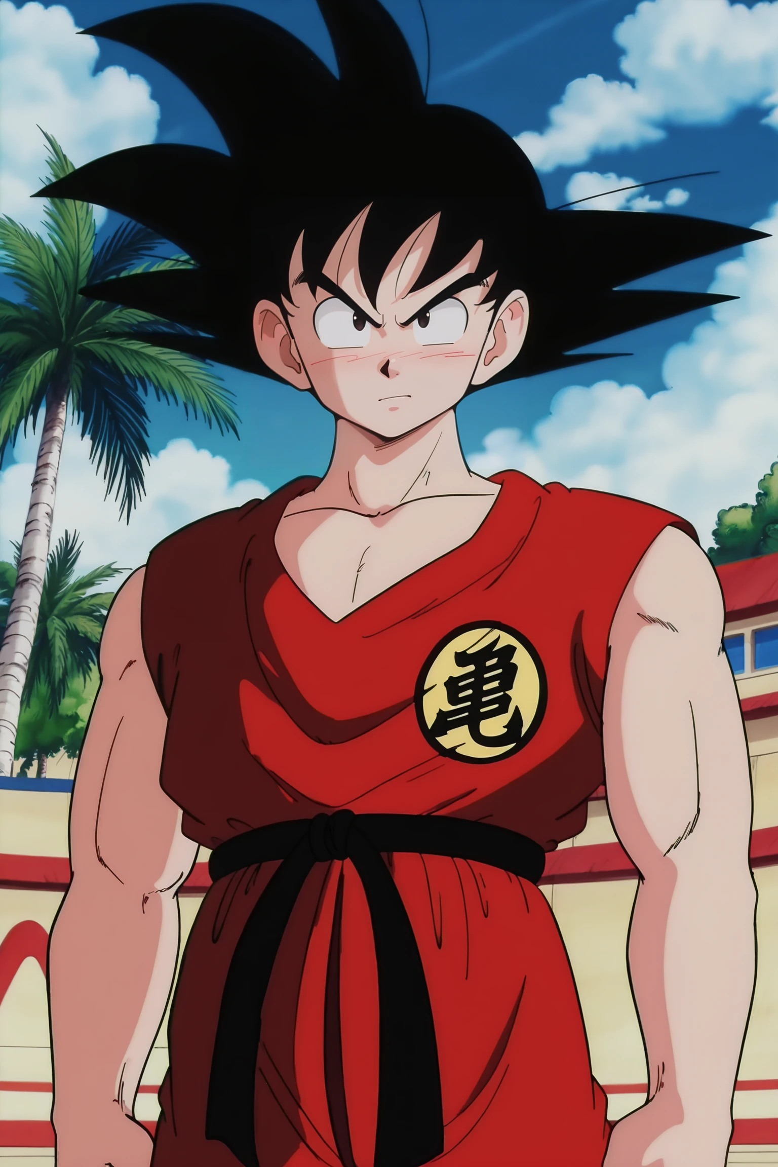 clothes writing, blue footwear, dougi, monkey tail, white legwear, symbol, red topwear, red pants, print topwear, blue wristband, blue sash, sleeveless, socks, shoes