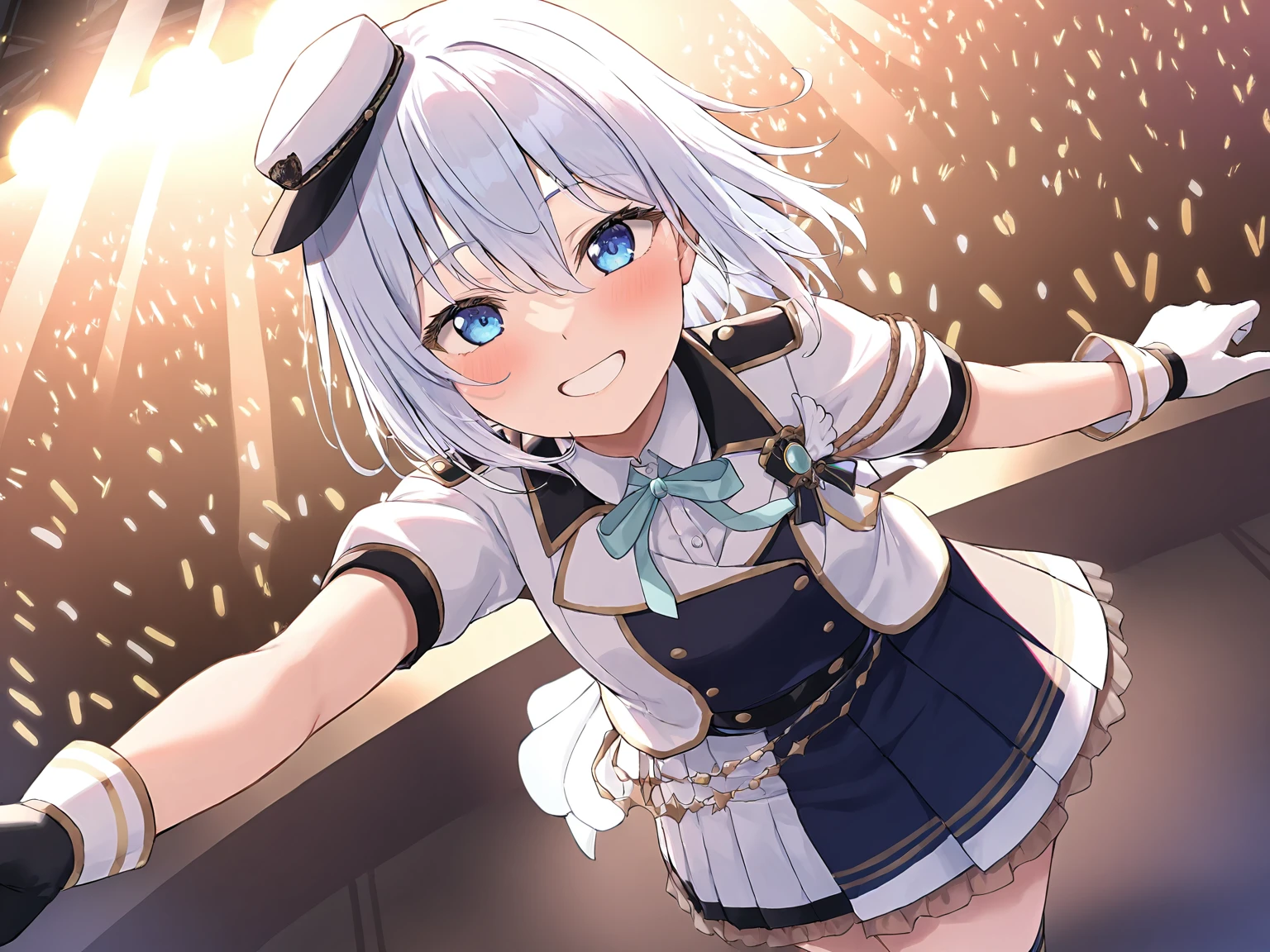 kurata mashiro,kurata mashiro idol cloth,white hair,short hair,blue eyes,skirt,gloves,hat
