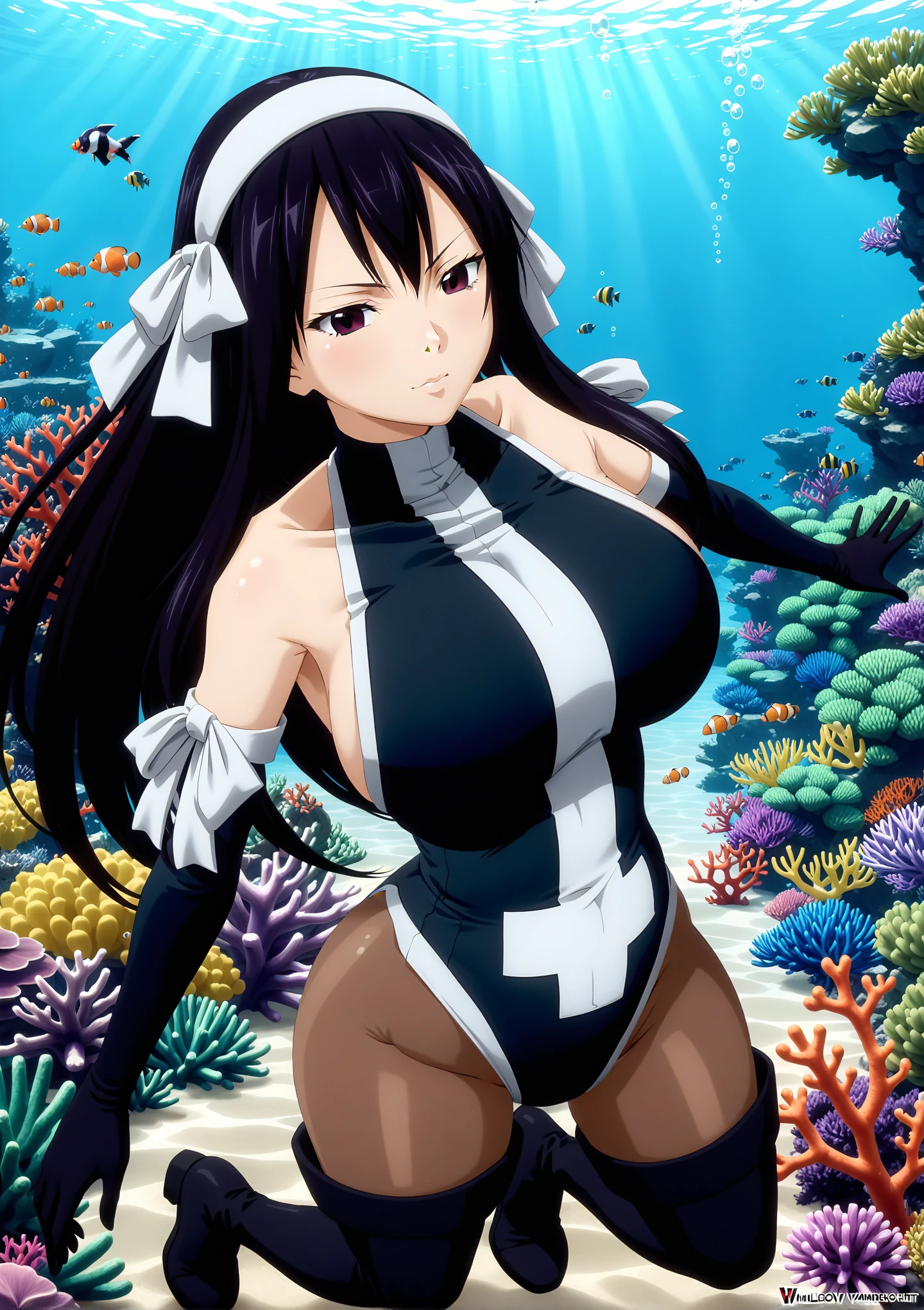 black hair, purple eyes, hair ribbon, white hairband, hairband, long hair, breasts, large breasts