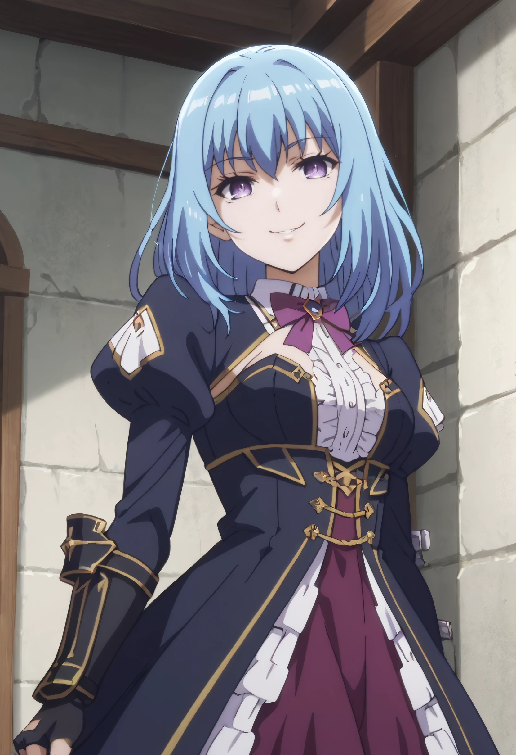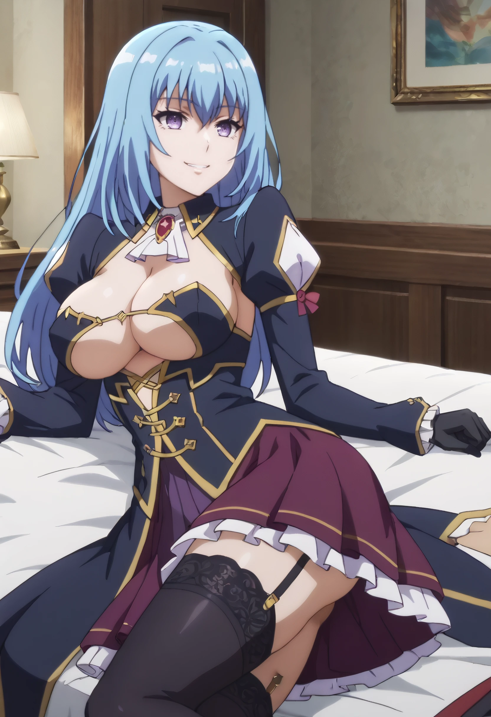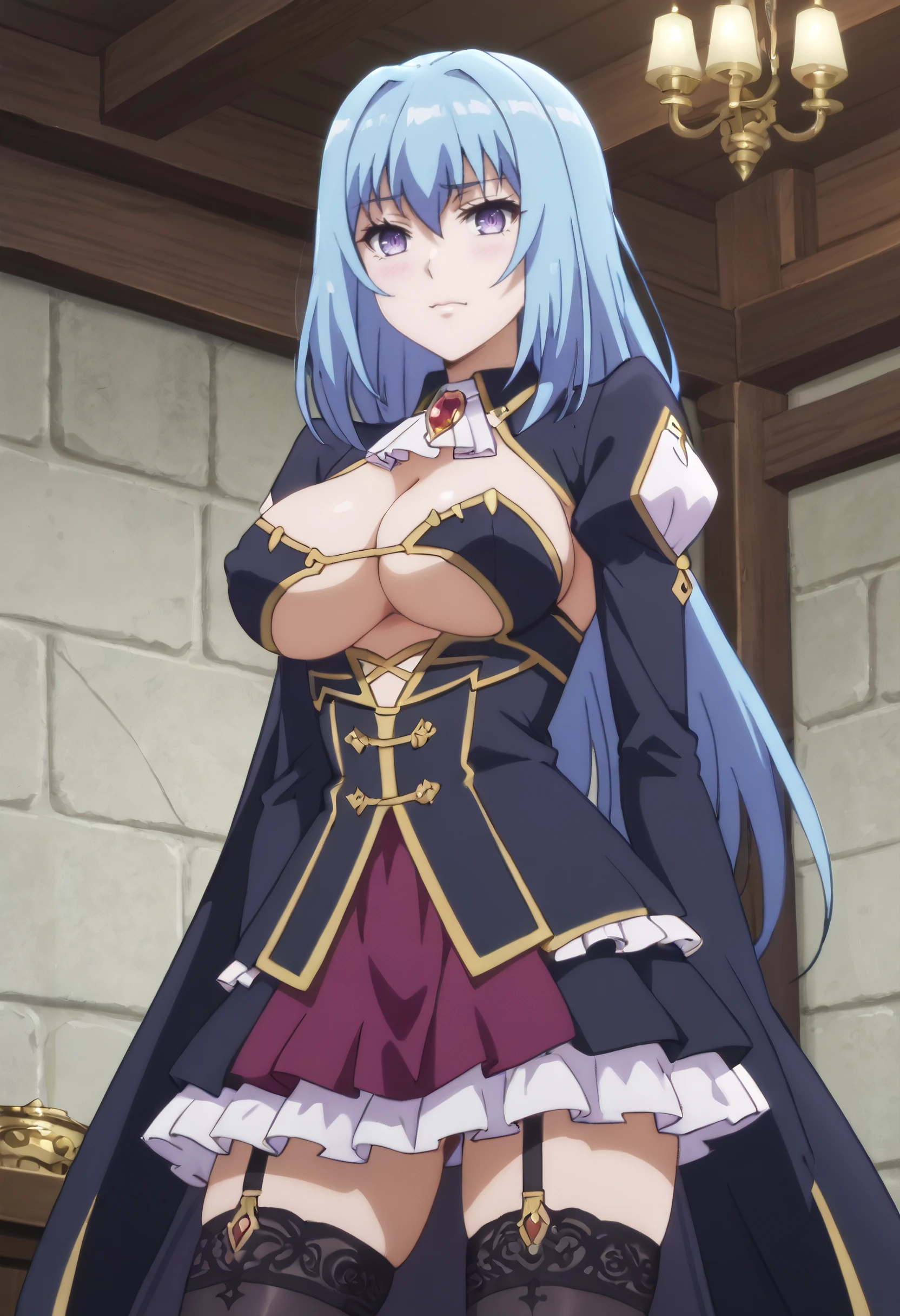 ErisCleavage, cleavage, breasts, covered , large breasts, ascot, long sleeves, gloves, brooch, thighhighs, detached collar, gem, black legwear, skirt, cape, detached sleeves, back cutout, juliet sleeves, puffy sleeves, frills, garter straps, underboob, cleavage cutout,