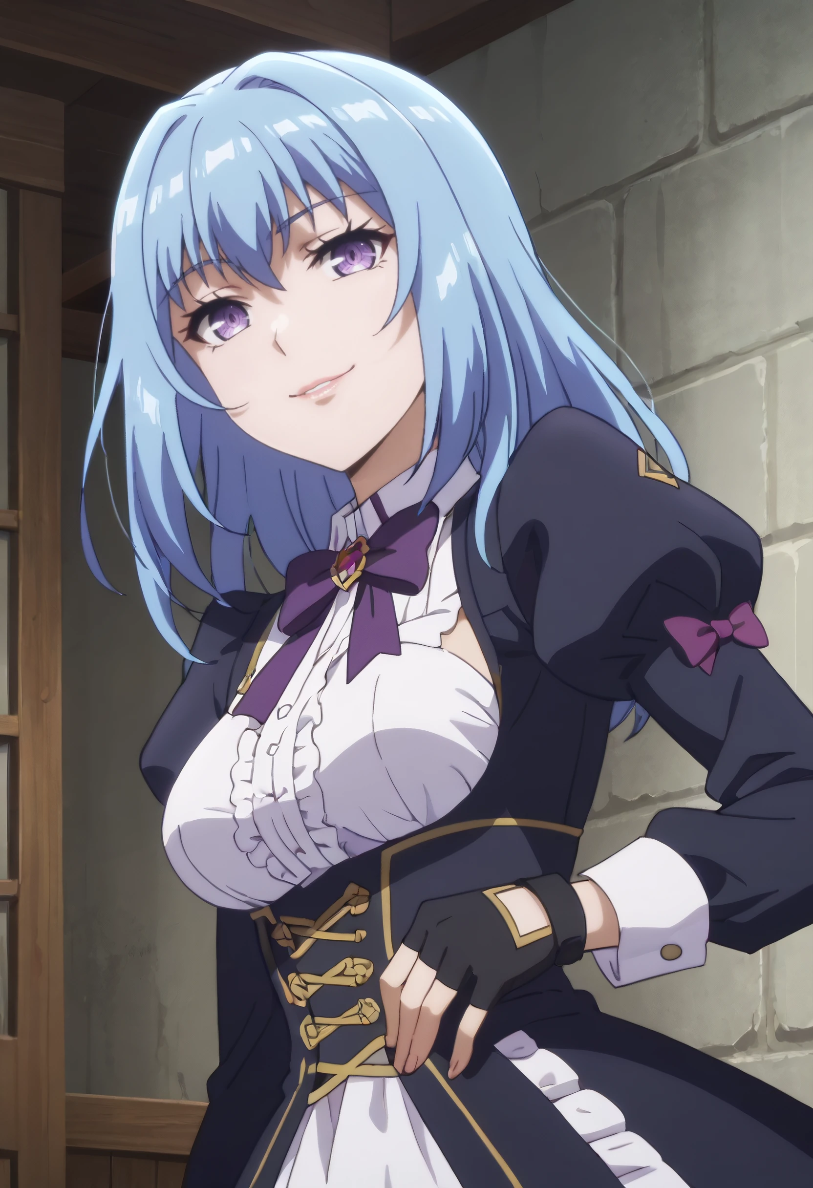 ErisDress, bow, bowtie, long sleeves, dress, ribbon, frills, gloves, shirt, puffy sleeves, purple bow, black gloves, fingerless gloves, black bow, black dress, white sleeves,