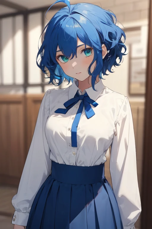 1girl, blue hair, short hair, ahoge, wavy hair, green eyes, blue eyes, white shirt, blue ribbon, brown jacket, breasts, blue long skirt,