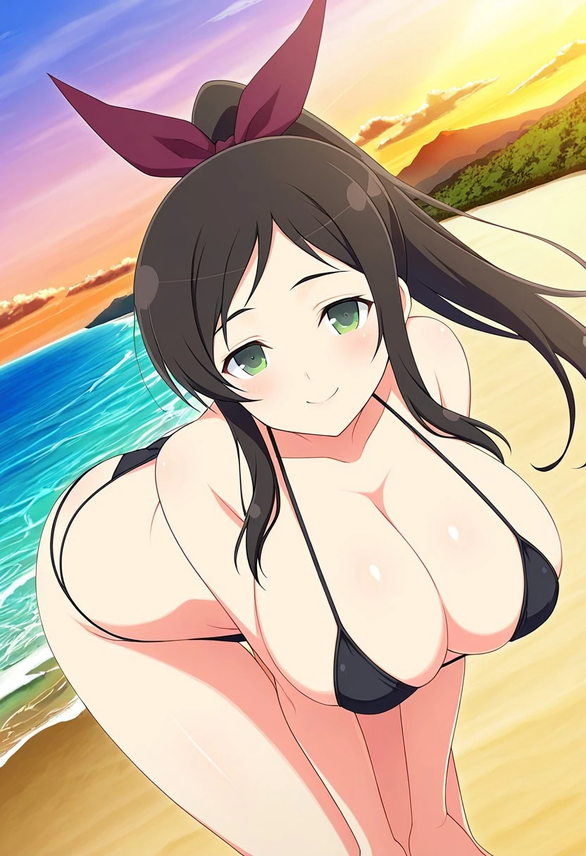 Murakumo,black_hair, long_ponytail, green_eyes, huge_breasts, hair ribbon, purple ribbon,