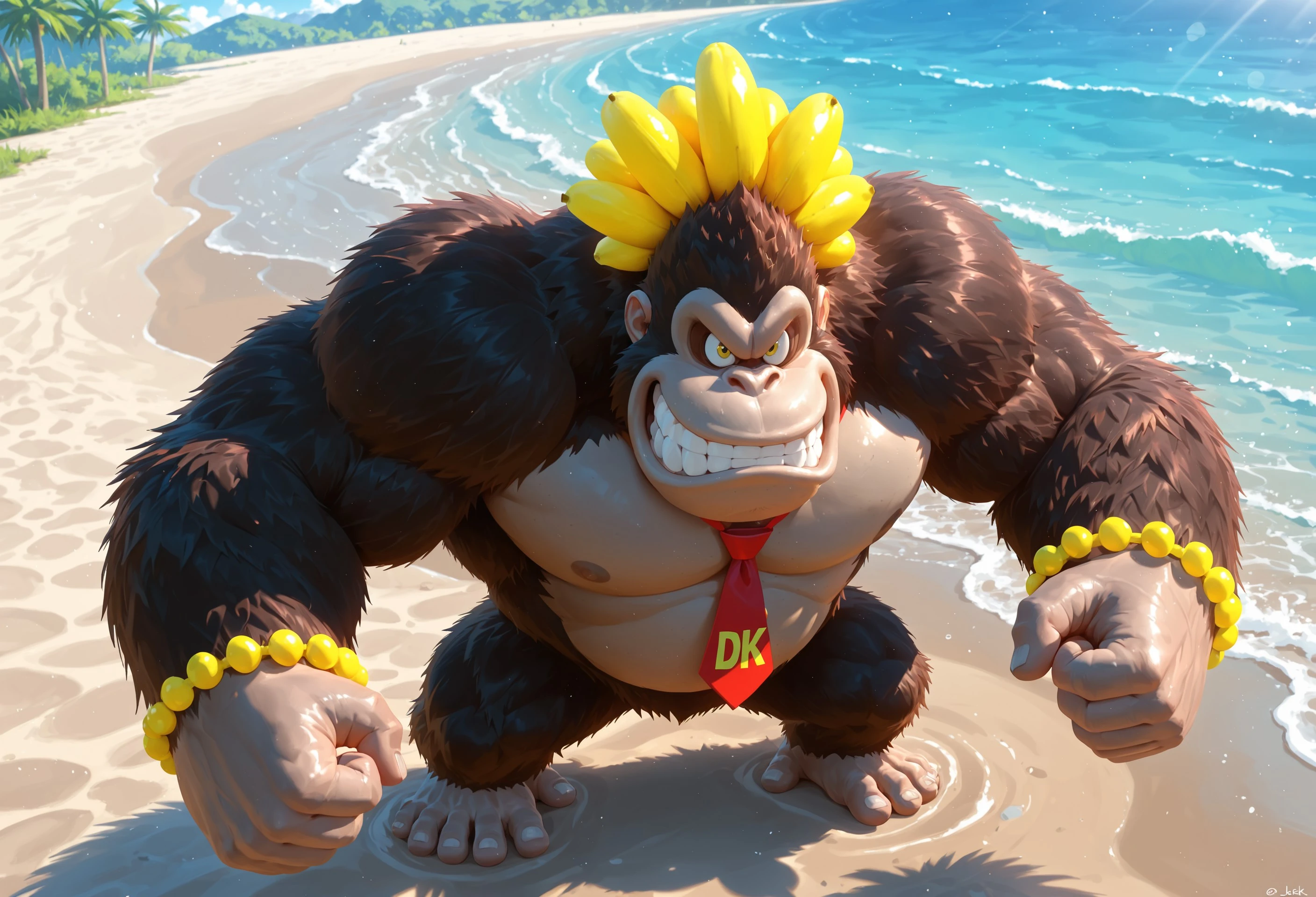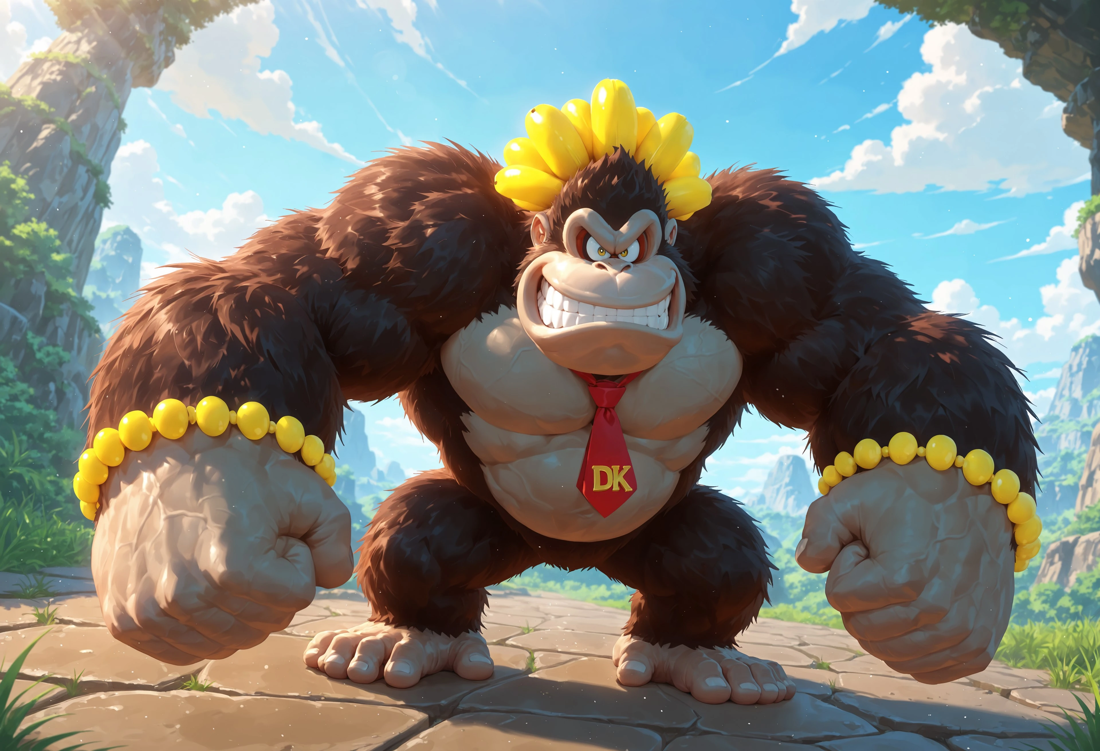 Donkey Kong, hairy body, red tie, tie says DK, long banana hair on head, banana bracelets, gorilla, gritted teeth, big fists, red eye outlines, angry eye brows, gorilla feet, muscles, big mouth, white sclera, dark yellow eyes, ((hunched back, hunched pose))