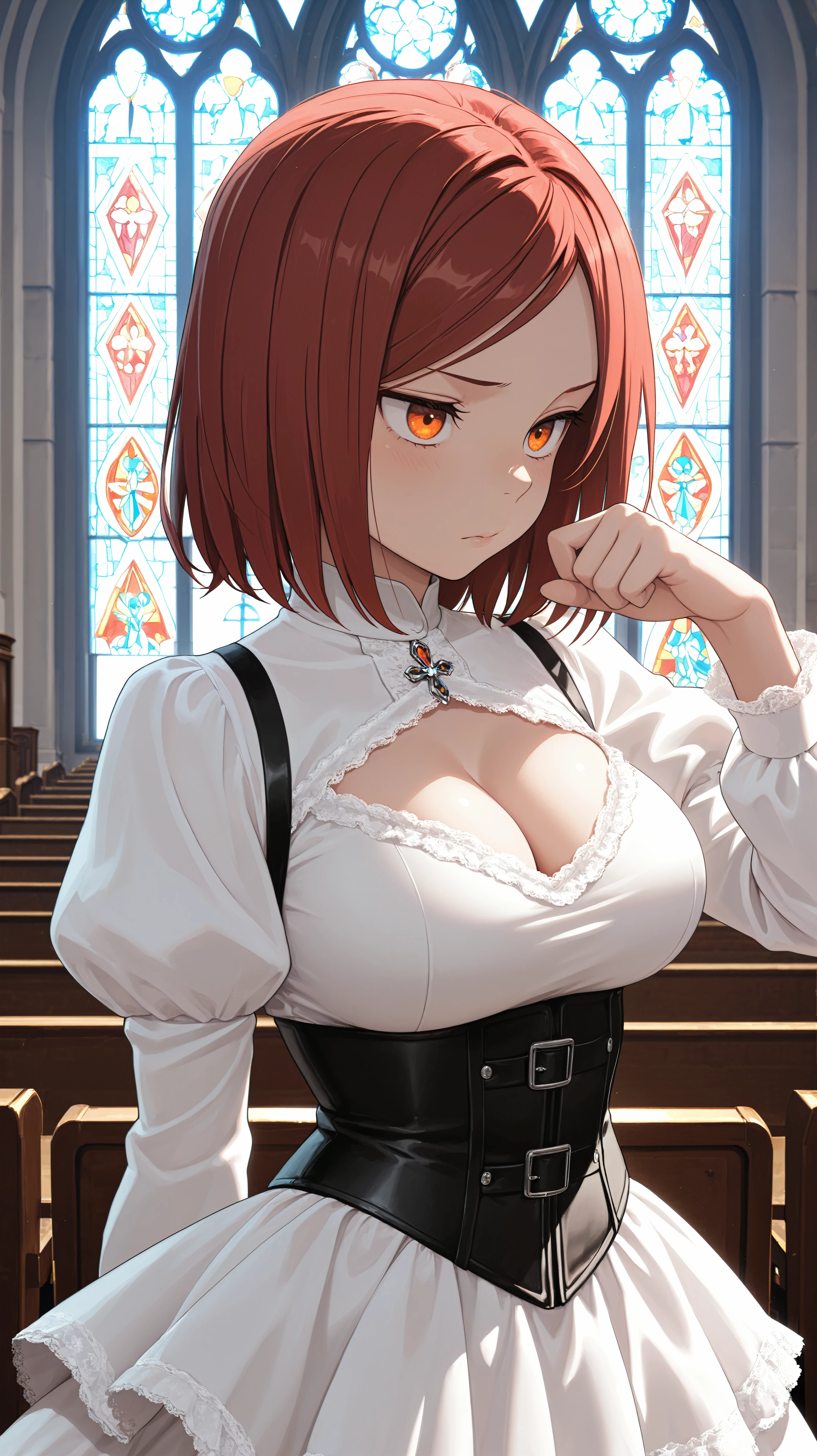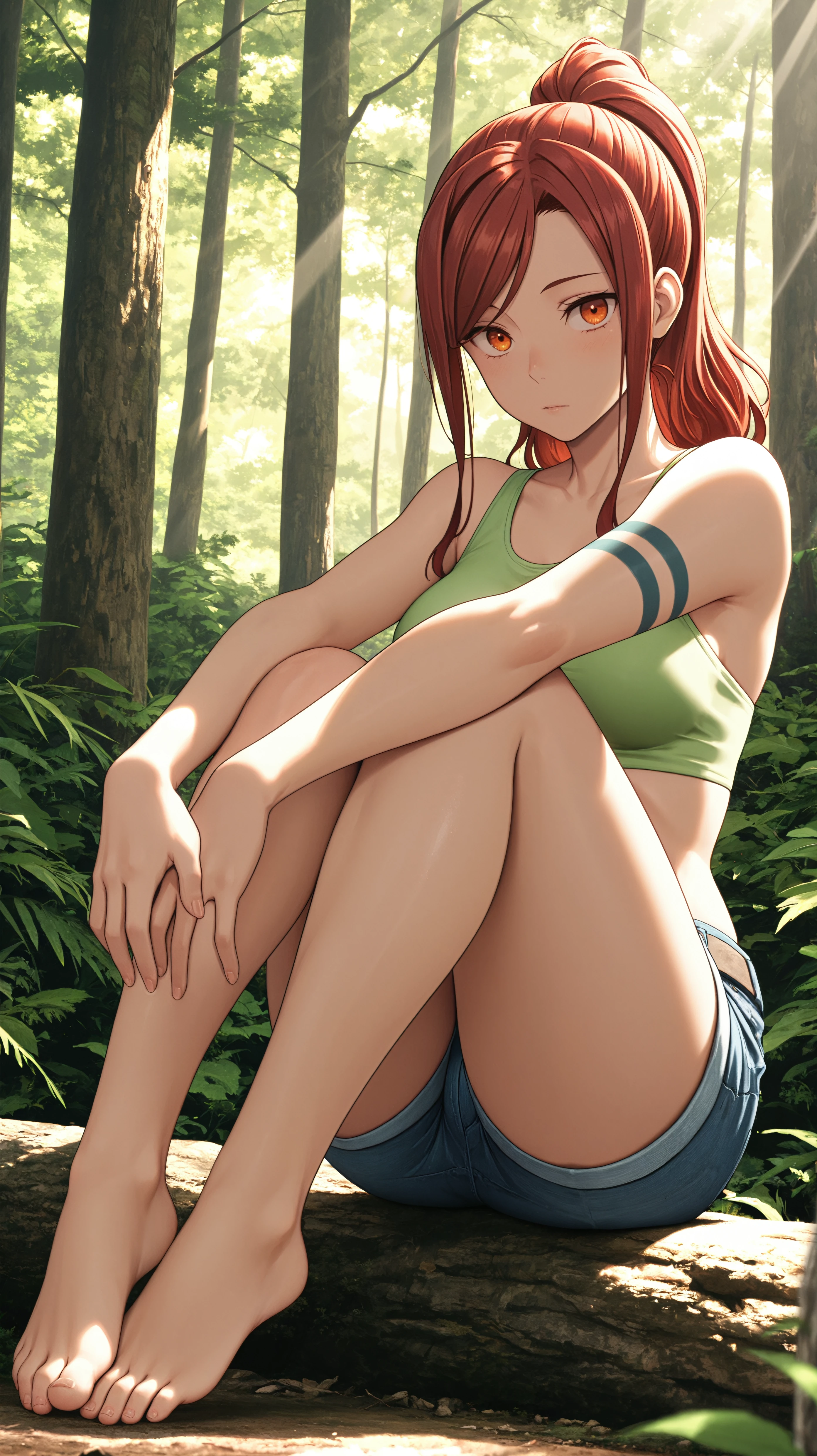 long hair, red hair, bangs, orange eyes, green top, denim shortsDescription