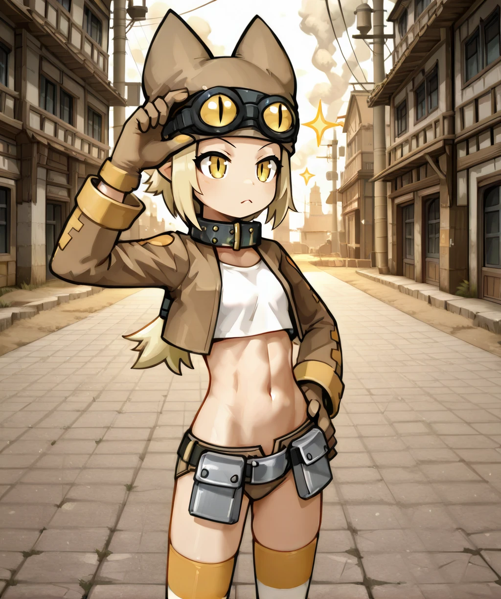 animal hat, goggles on head, - crop top, or white tubetop, cropped jacket, - brown shorts, brown gloves, long sleeves, - collar, or neck belt,navel or midriff, - triped thighhighs, paw shoes,
