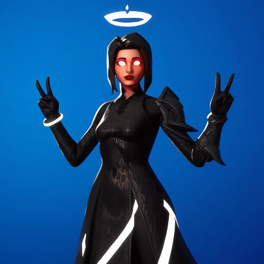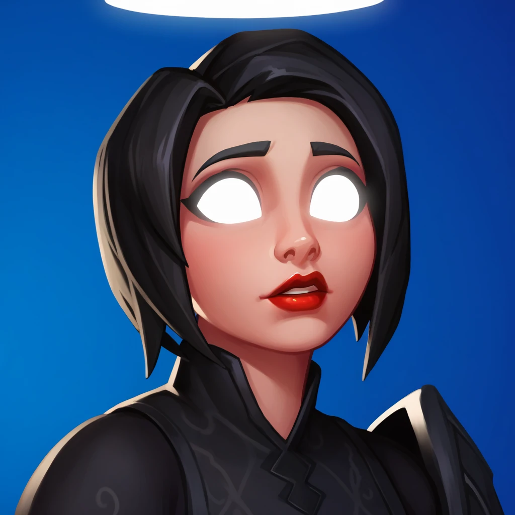 ark_Shadow, 1girl, solo, black hair, short hair, no pupils, glowing eyes, red lipstick, glowing halo, white halo, black dress, gauntlet, black leggings, black boots,