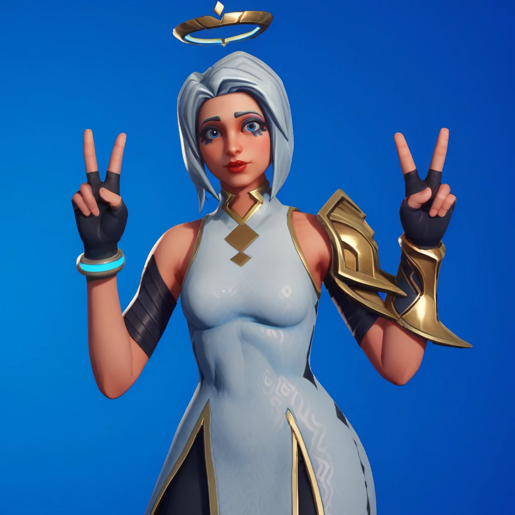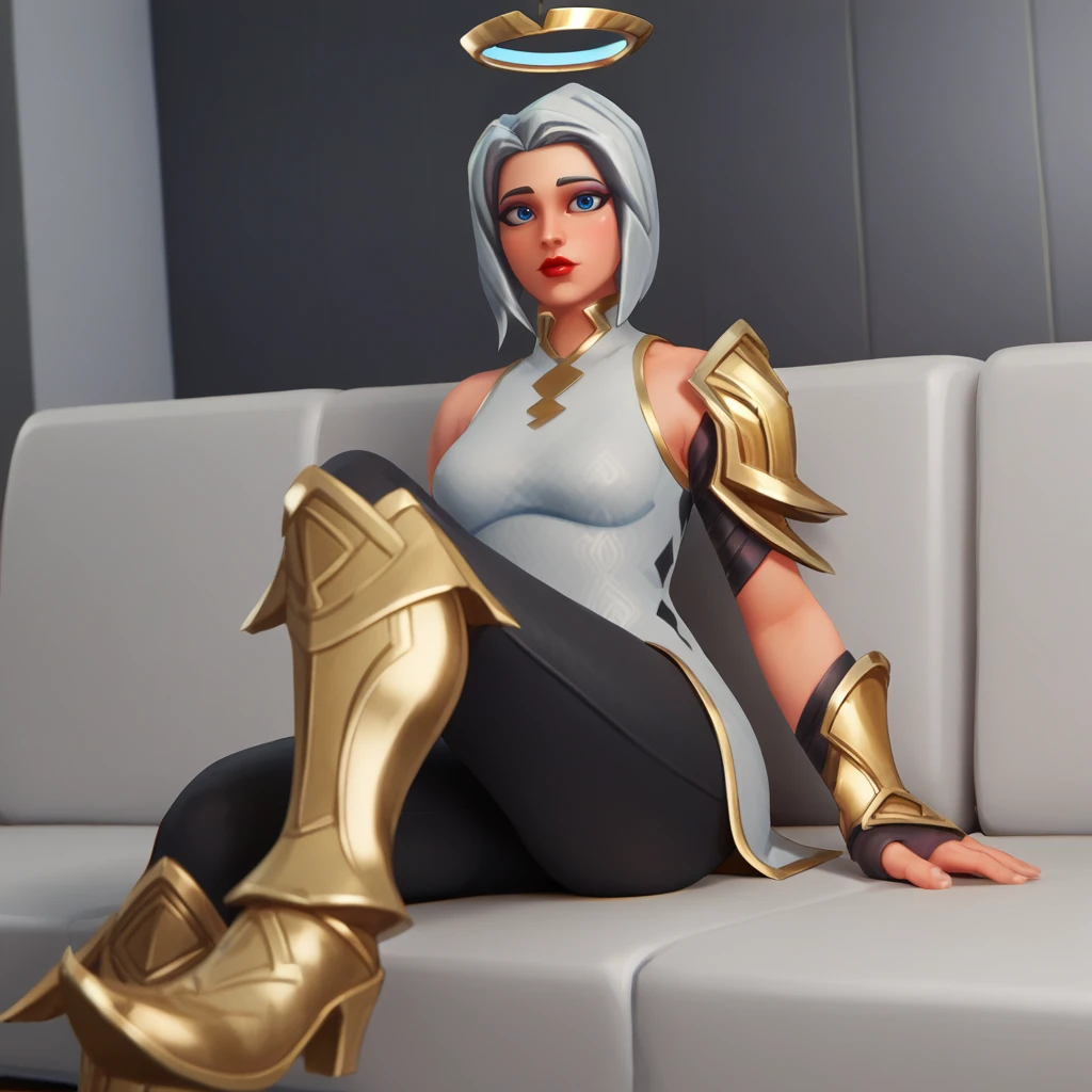 ark, 1girl, solo, white hair, short hair, blue eyes, lipstick, halo, white dress, black leggings, single gauntlet, gloves, gold boots,