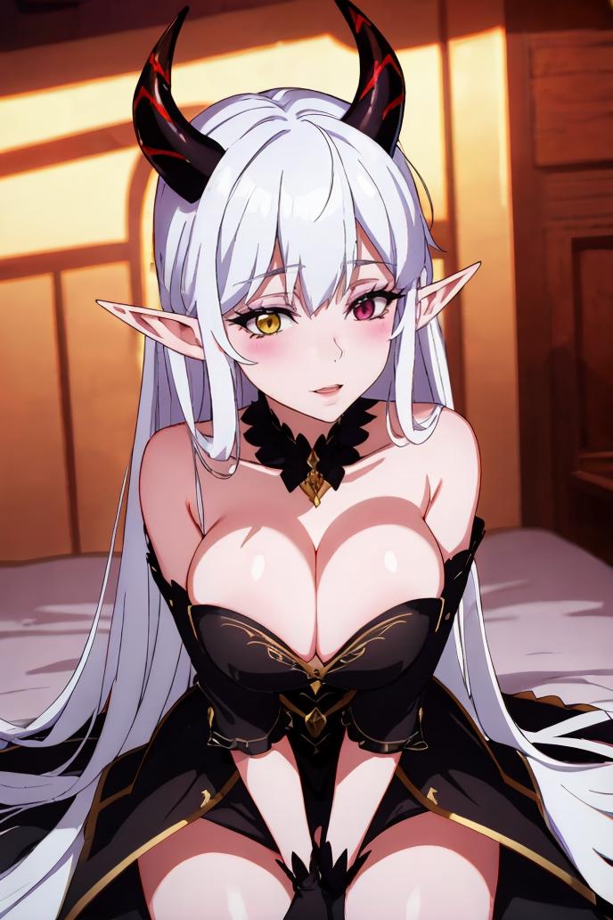 black dress, heterochromia, red eye, yellow eye, elf, red horns,