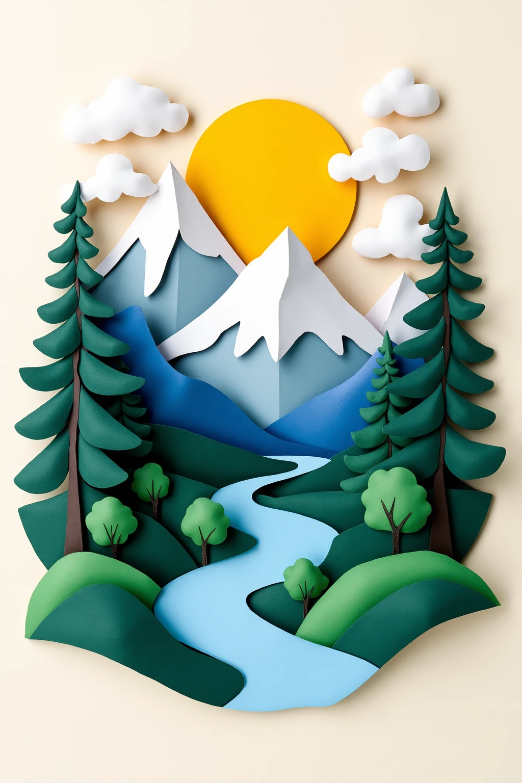 10. Paper - cut art style, a landscape with a big yellow sun, snow - capped mountains, and a winding river, forming a magnificent natural view.