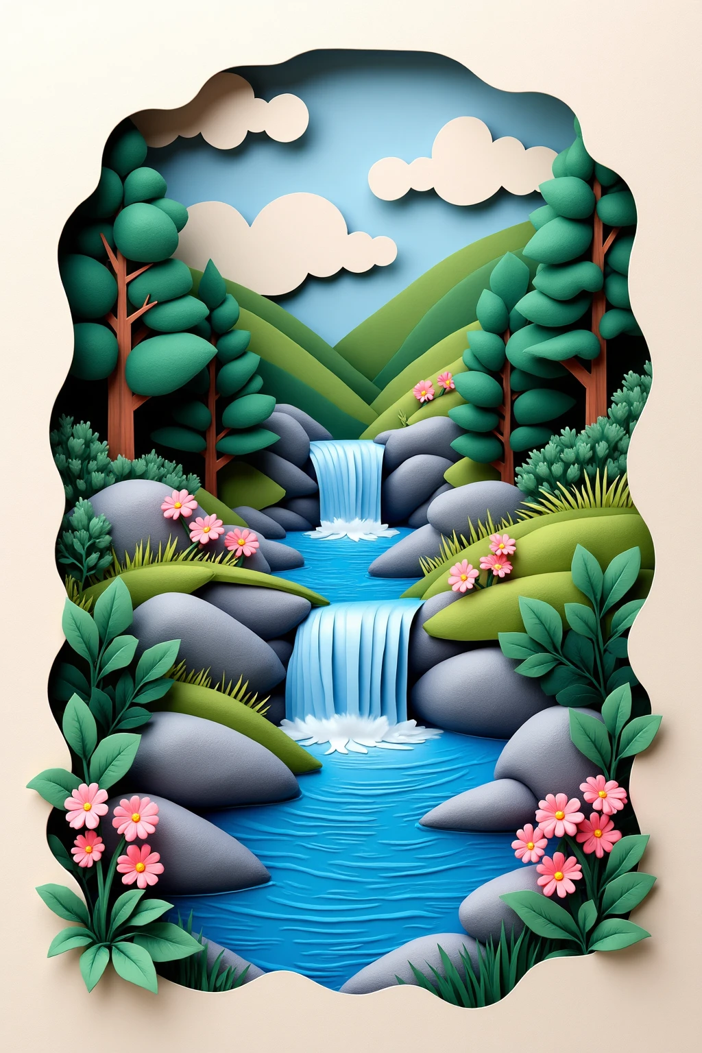 7. Paper - cut art style, a riverside with a waterfall, rocks, and blooming flowers, building a peaceful water - related scene.
