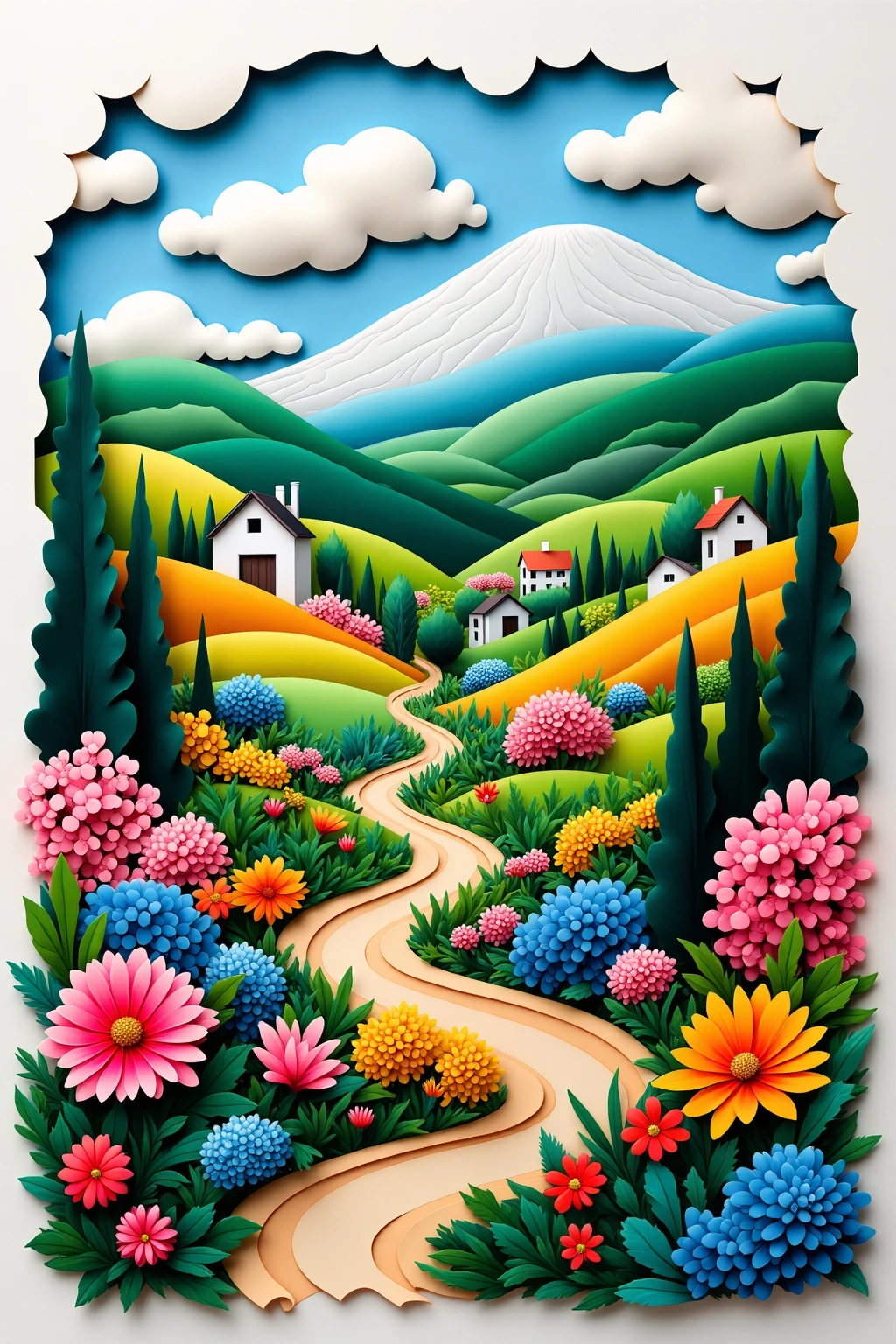 6. Paper - cut art style, a valley full of vibrant flowers, colorful hills, and a clear sky, presenting a lively natural picture.