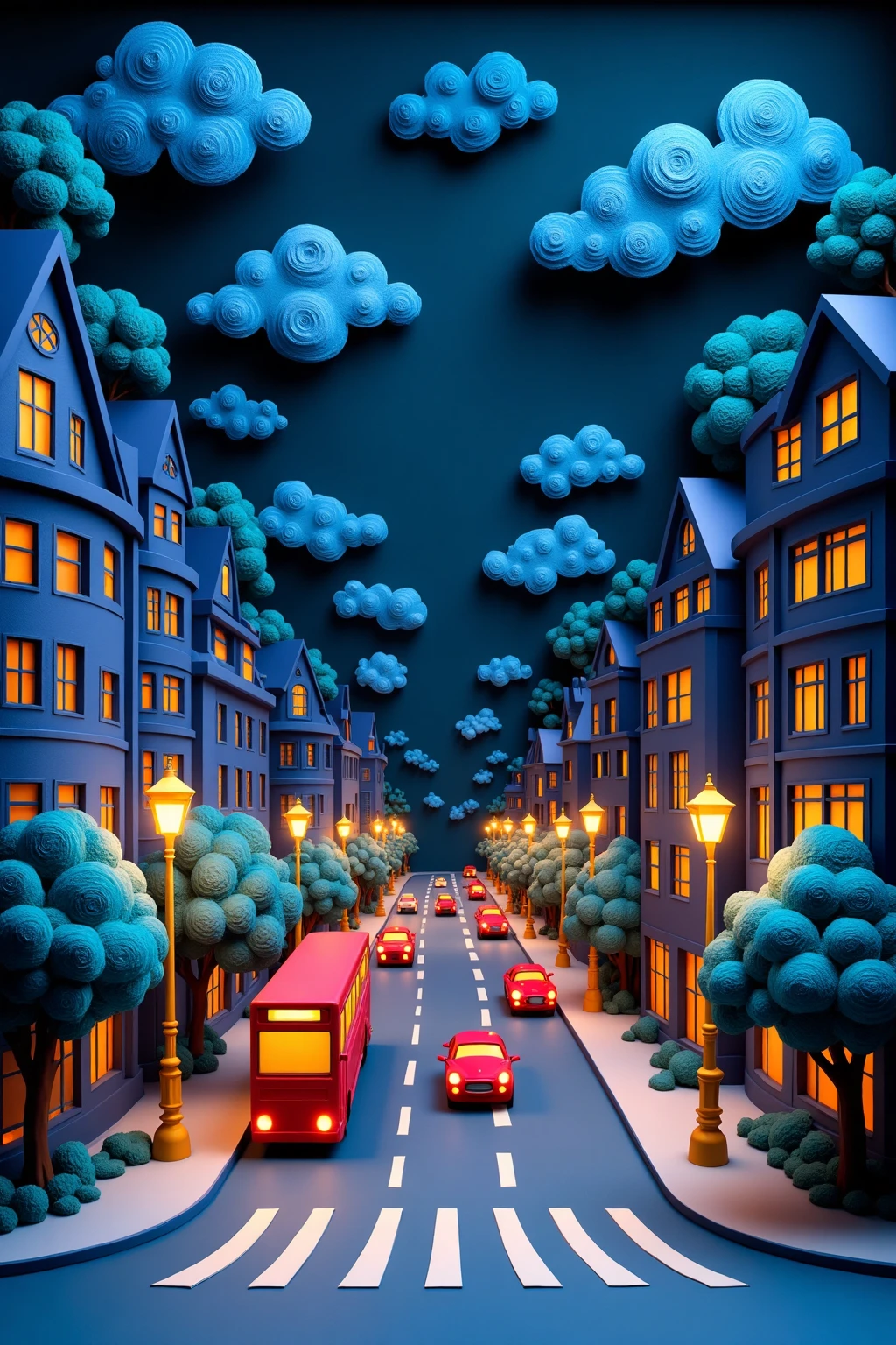 2. Paper - cut art style, a bustling city street at night, with tall buildings, glowing streetlights, a red bus, and fluffy clouds in the dark sky.