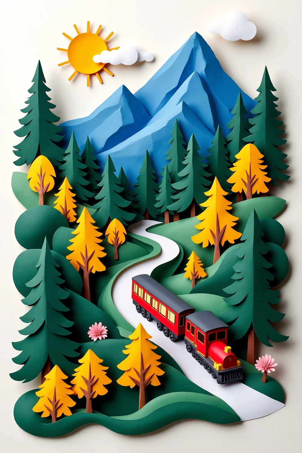 4. Paper - cut art style, a mountainous area with blue peaks, a winding path, and a small train passing through golden - colored forests.