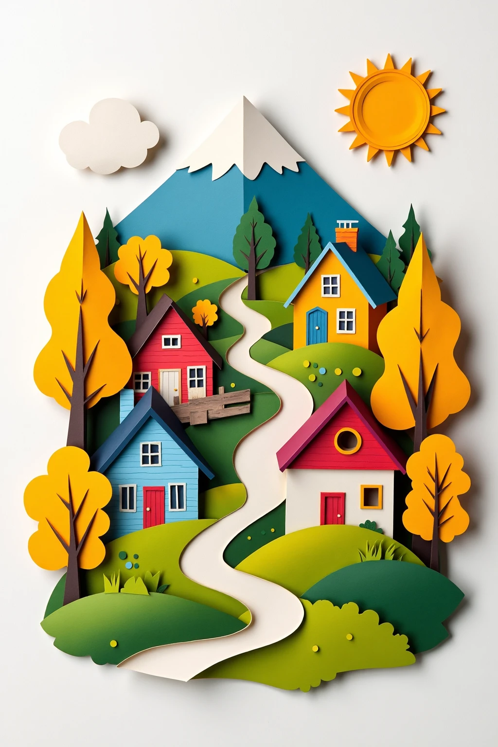 8. Paper - cut art style, a village with colorful houses, a sun, and yellow trees, showing a cheerful rural atmosphere.