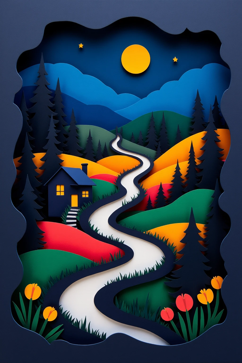 9. Paper - cut art style, a night sky with a full moon, a winding road, a house, and colorful fields, creating a mysterious rural night.