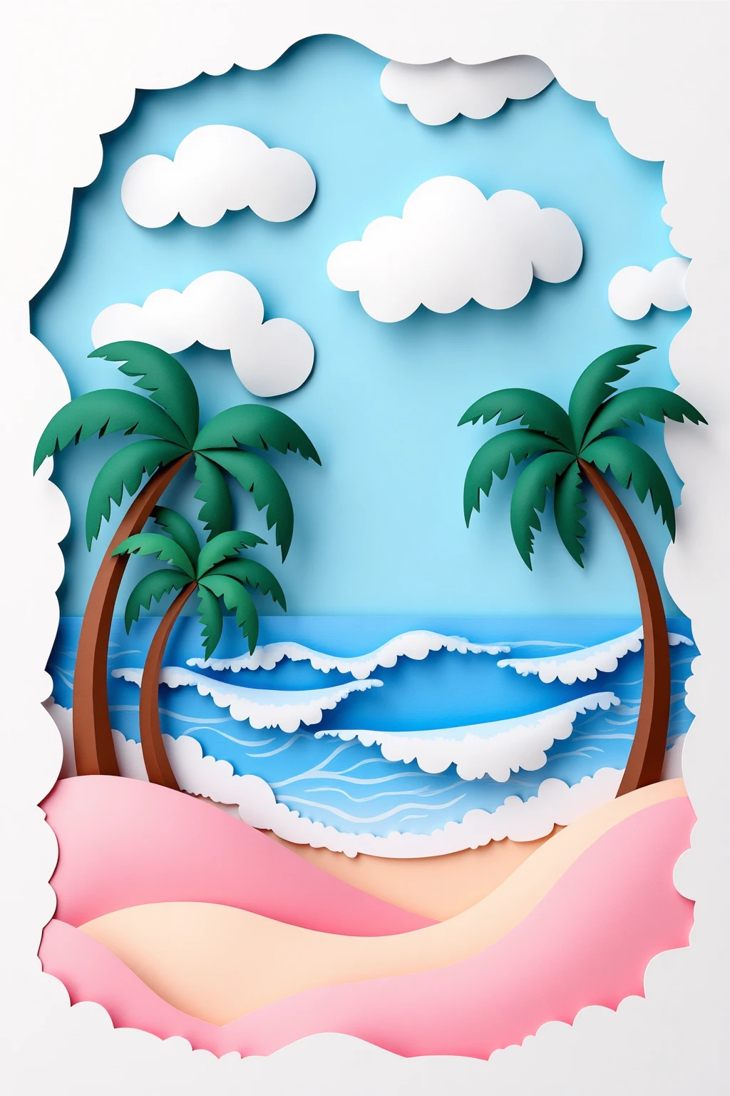 3. Paper - cut art style, a beach scene with pink sand, blue waves, white clouds, and palm trees, giving a dreamy coastal vibe.
