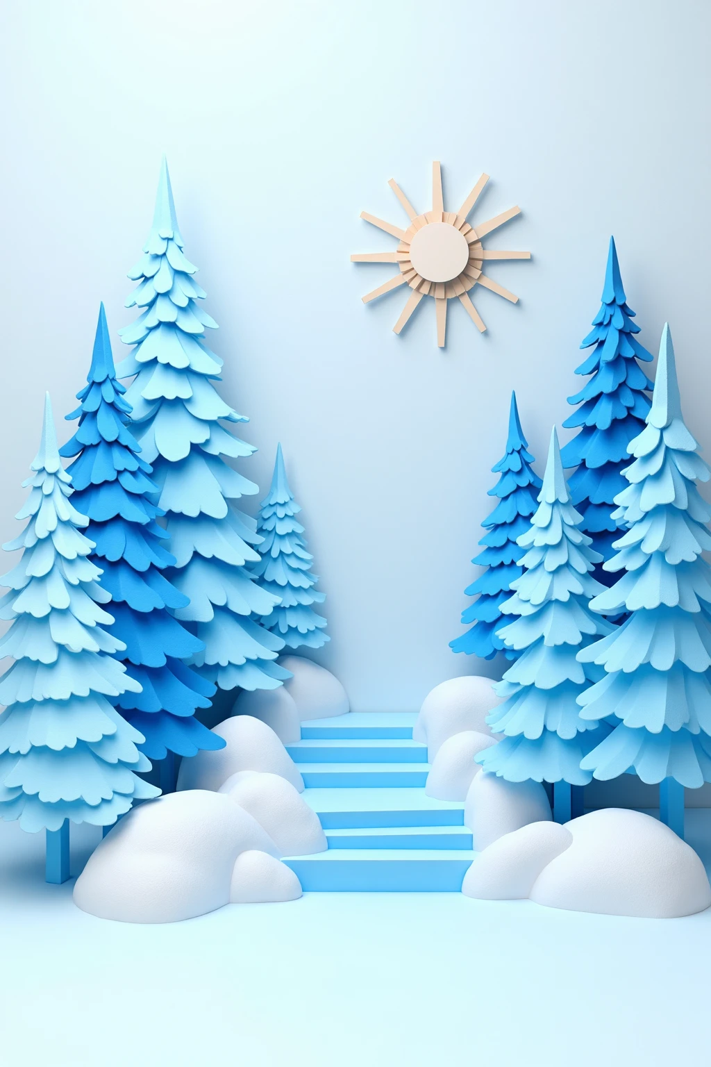 5. Paper - cut art style, a snowy landscape with blue pine trees, a staircase of ice, and a bright sun, making a pure winter wonderland.