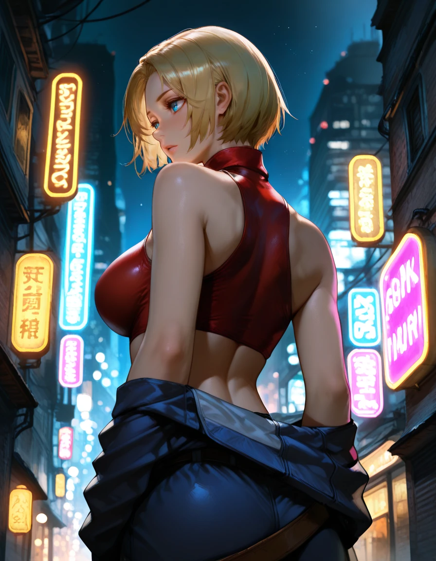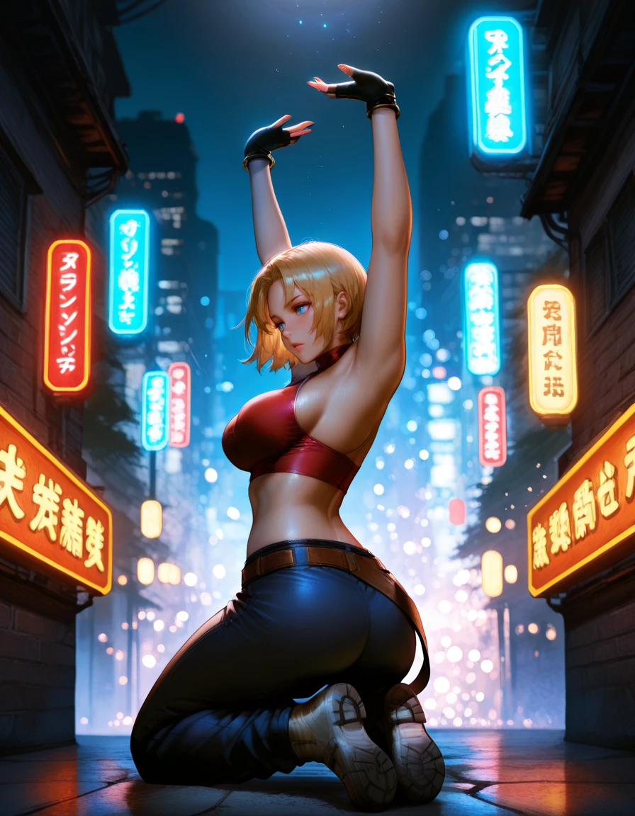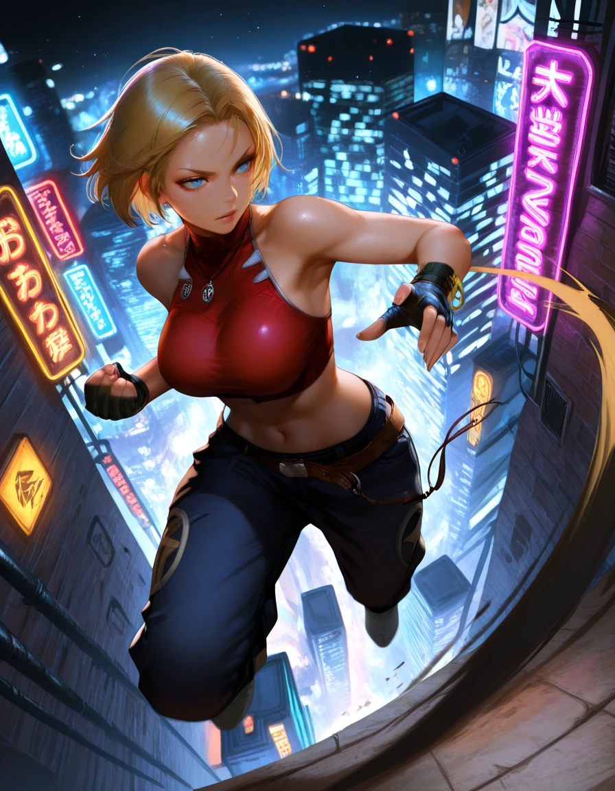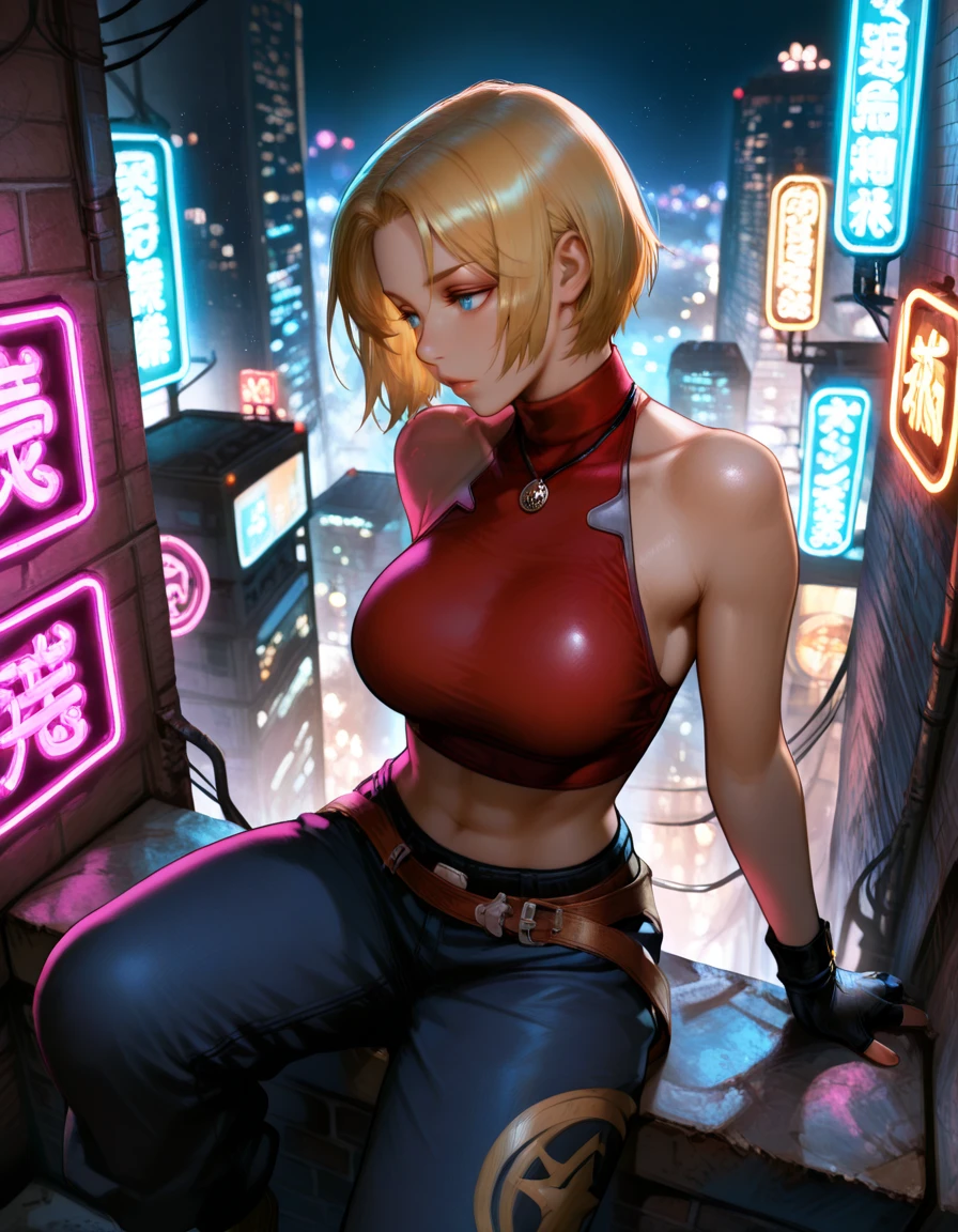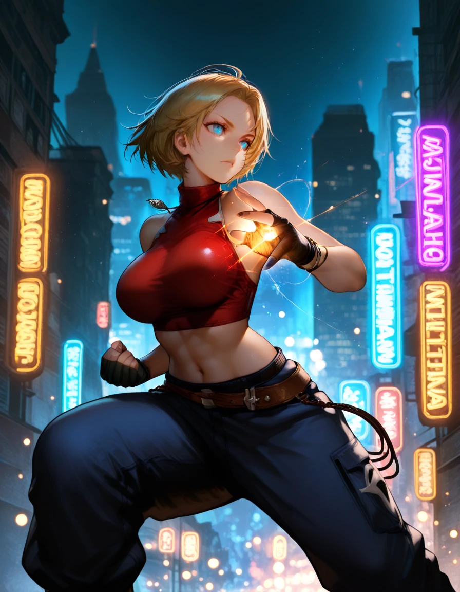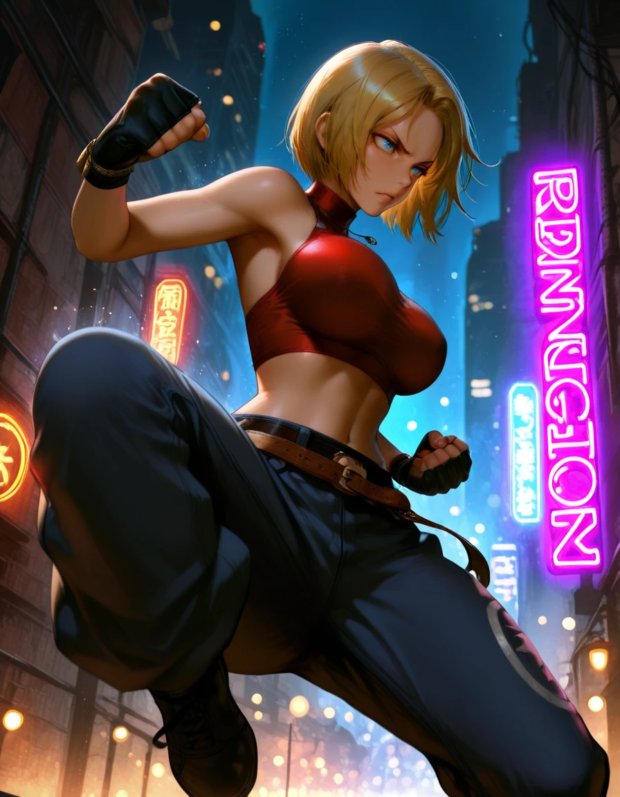 sleeveless turtleneck, sleeveless, baggy pants, loose belt, crop top, blue_Pants, fingerless gloves, sneakers,