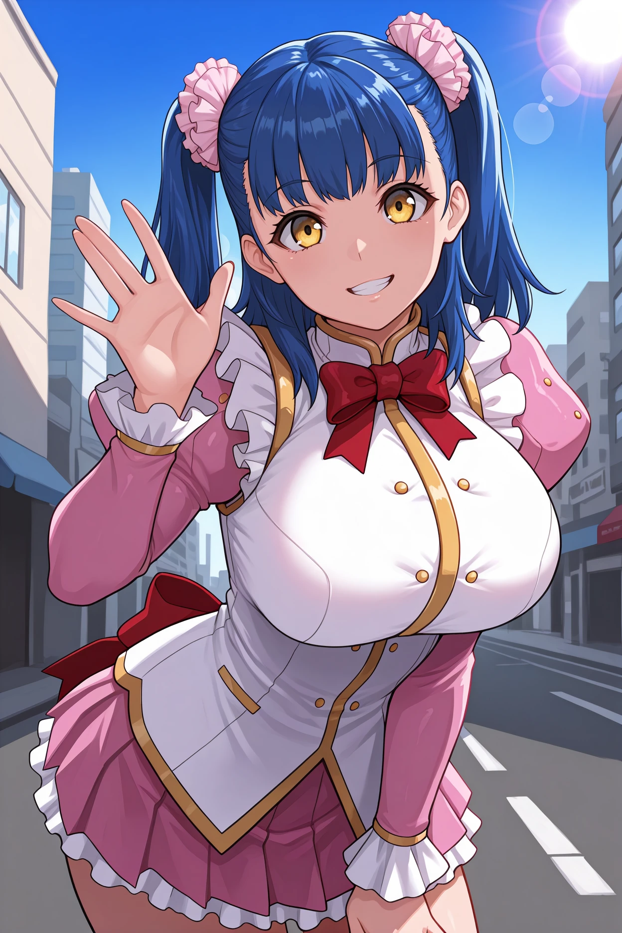 Add "red bowtie, frills, white vest, pink sleeves, juliet sleeves, pink skirt, miniskirt, pleated skirt" for her typical look.
