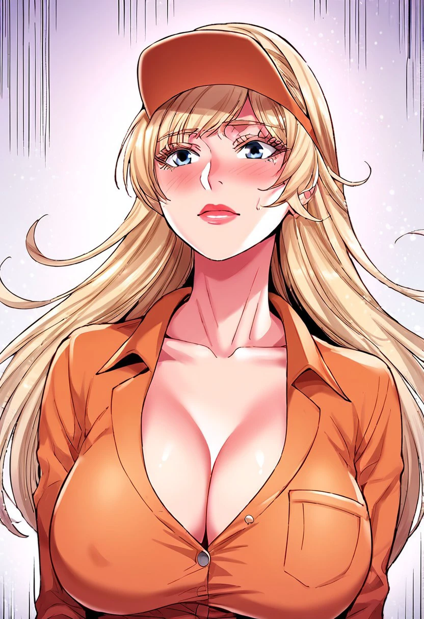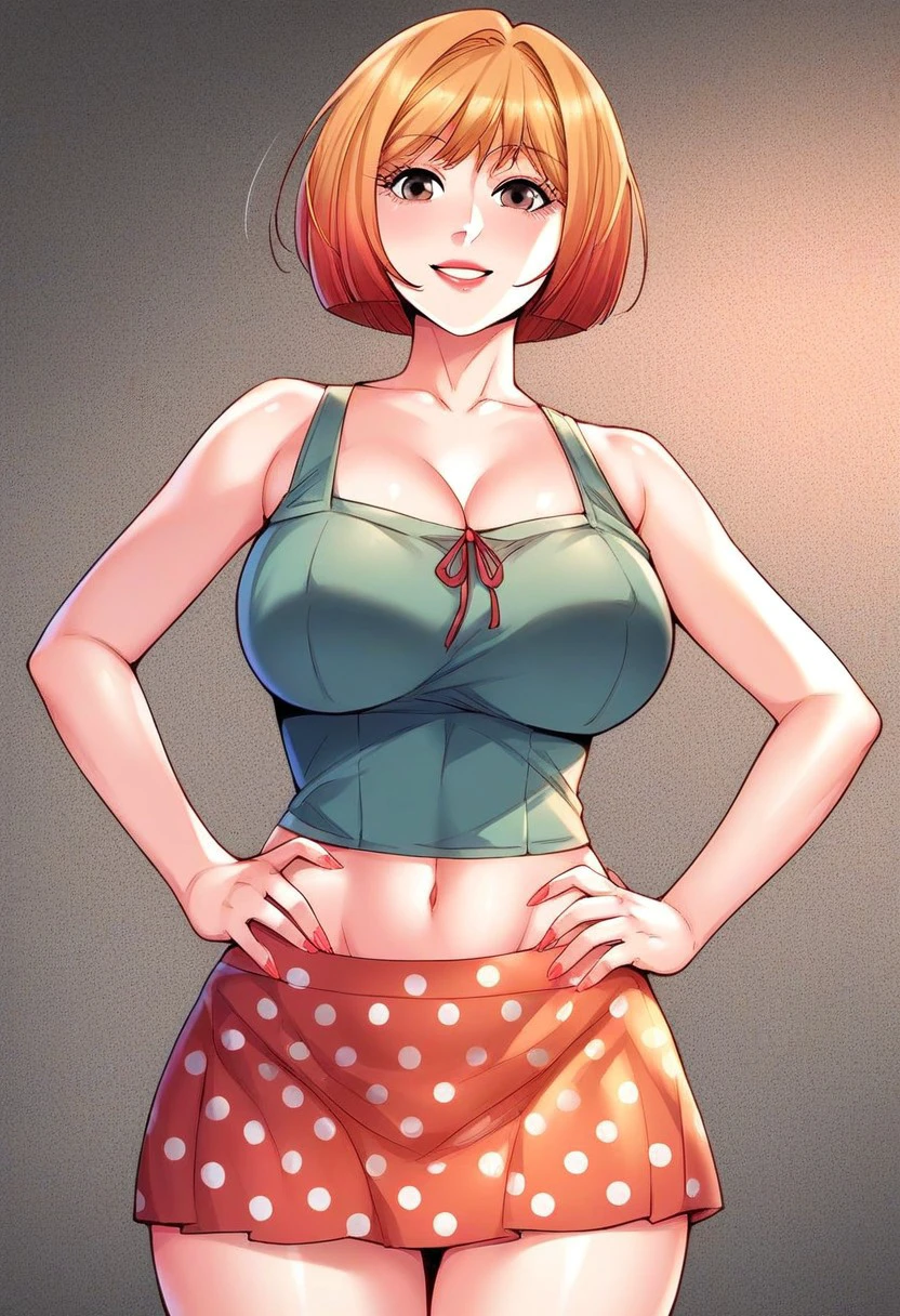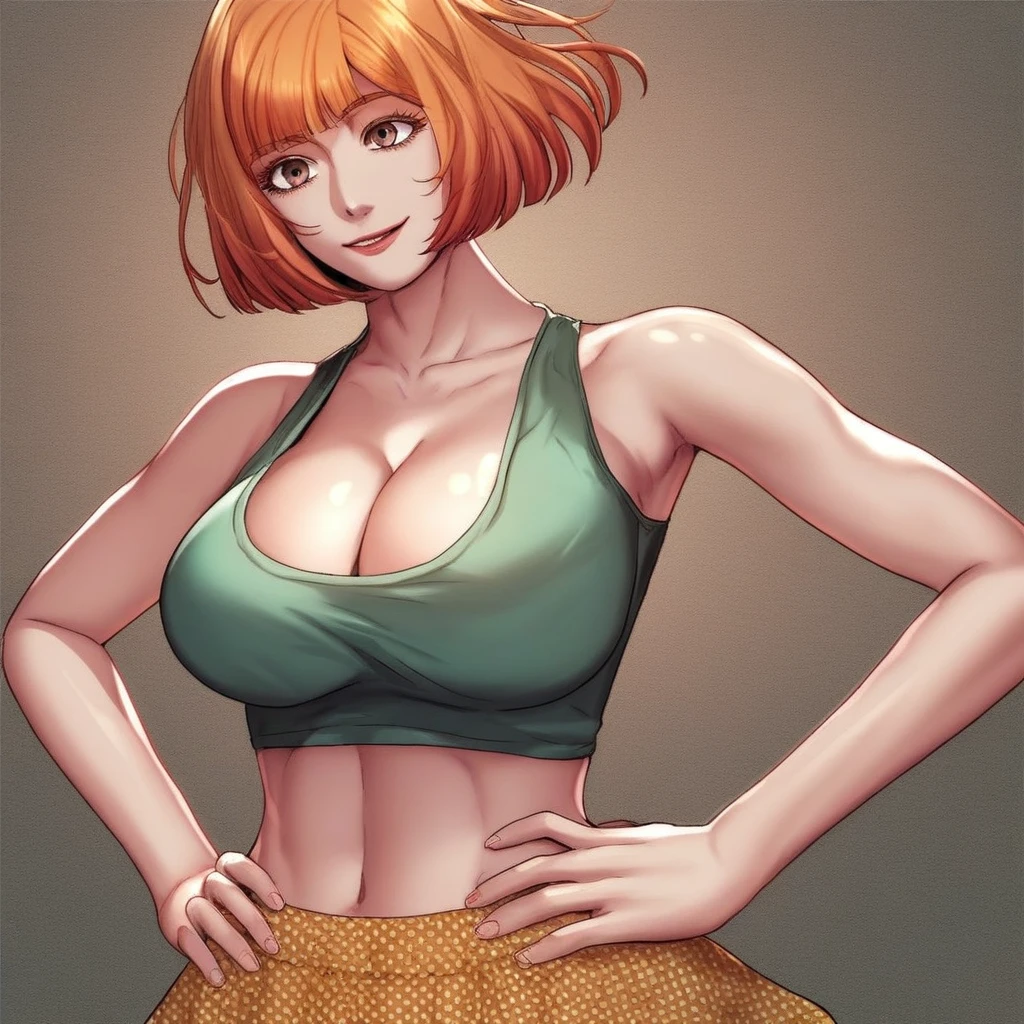 Mi-Ri: mi-ri, piercing light brown eyes, beautiful orange hair, beautiful medium bob haircut, bangs, huge and shaggy breasts,