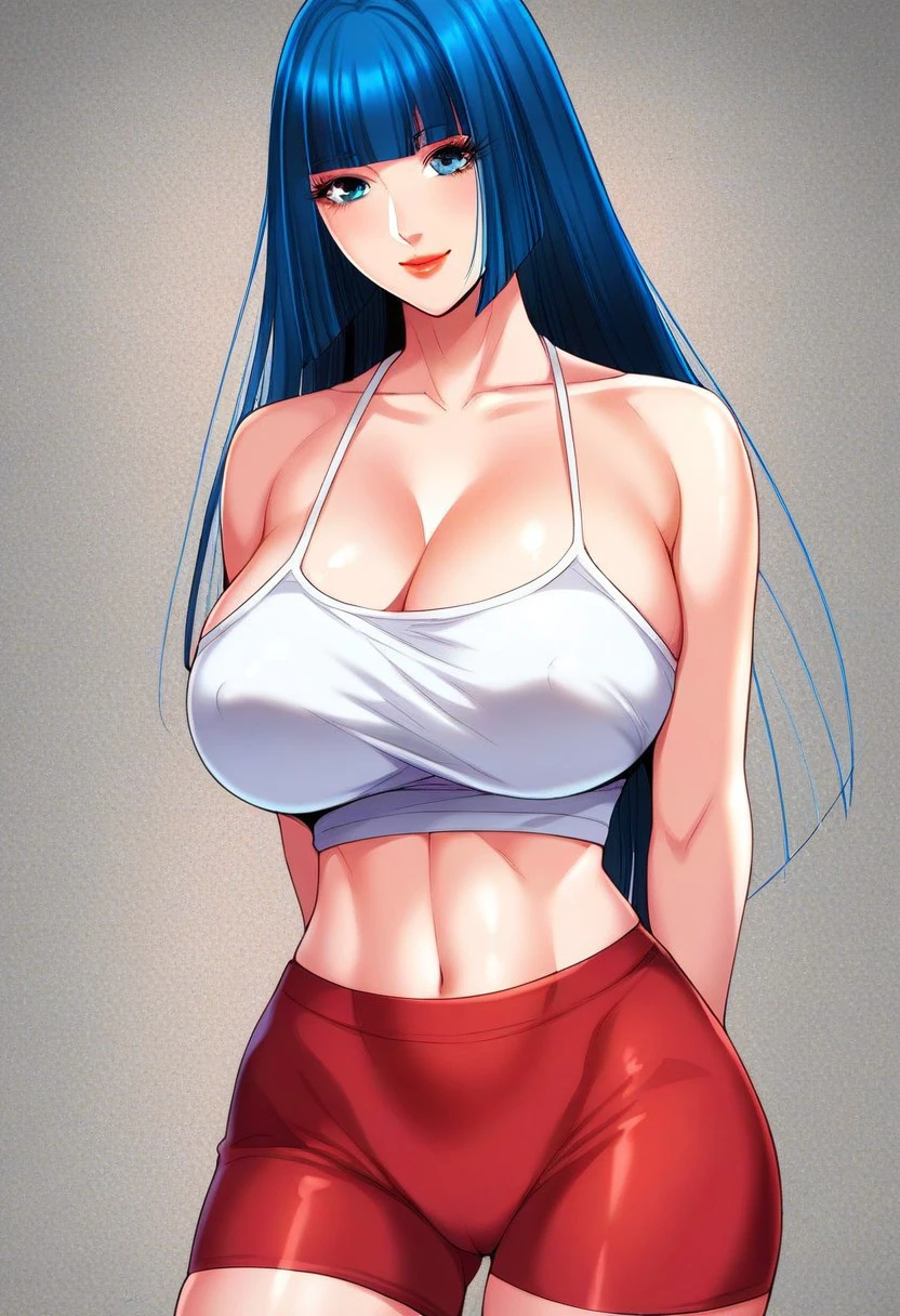 Ji-Woo: ji-woo, piercing light blue eyes, beautiful long blue hair, long cleopatra haircut, bangs, huge and shaggy breasts,