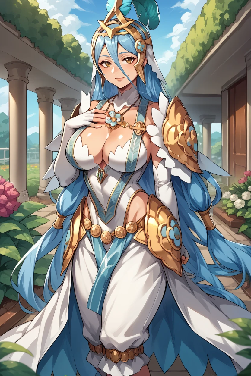 Add "legendaryAzu, blue hair, feather hair ornament, necklace, armored dress, cleavage, white gown, white pants, white elbow gloves, fingerless gloves, anklet" for Legendary Azura.