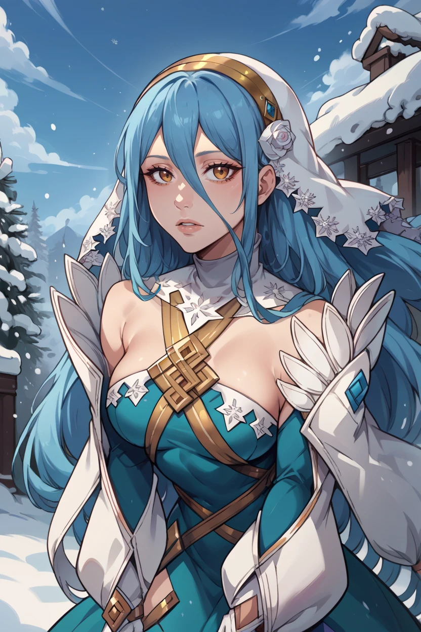 Add "defAzu, blue hair, white veil, white dress, blue straps, pendant, white elbow gloves, fingerless gloves, thighlet, asymmetrical legwear" for her standard appearance.