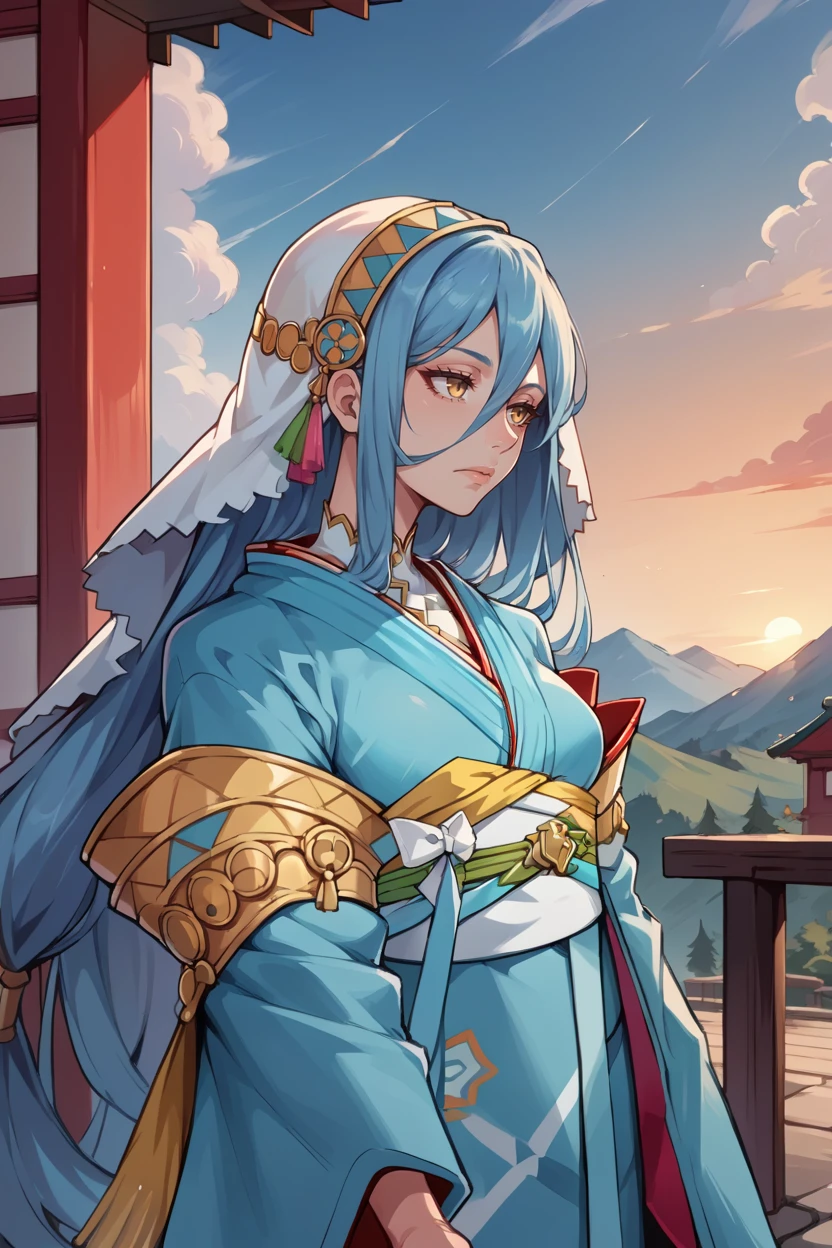 Add "nyAzu, blue hair, white veil, tassel, blue kimono, sash" for New Year Azura.