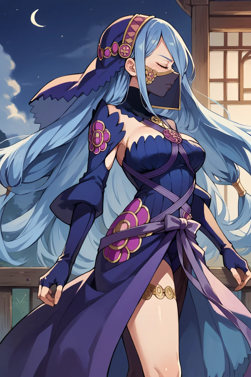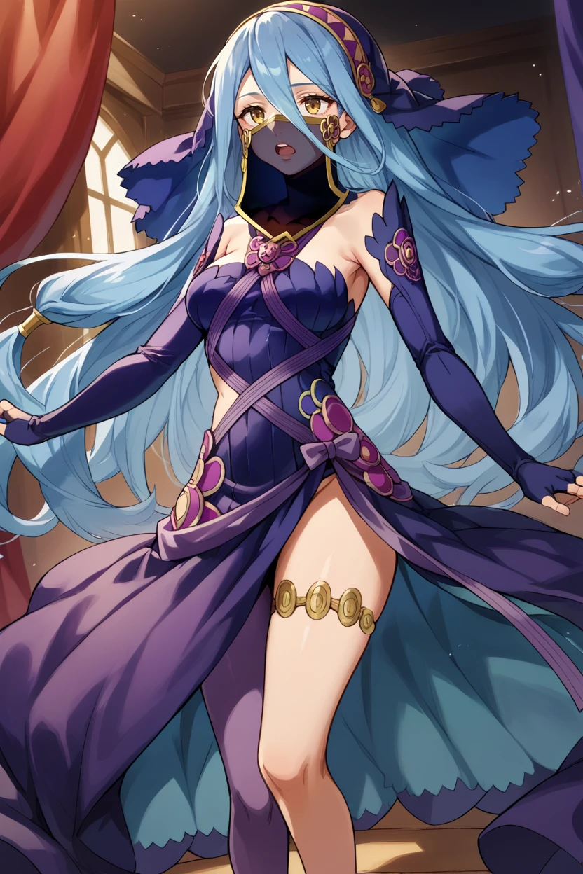 Add "performAzu, blue hair, purple veil, mouth veil, purple dress, purple straps, purple elbow gloves, fingerless gloves, single leg pantyhose" for Performing Azura.