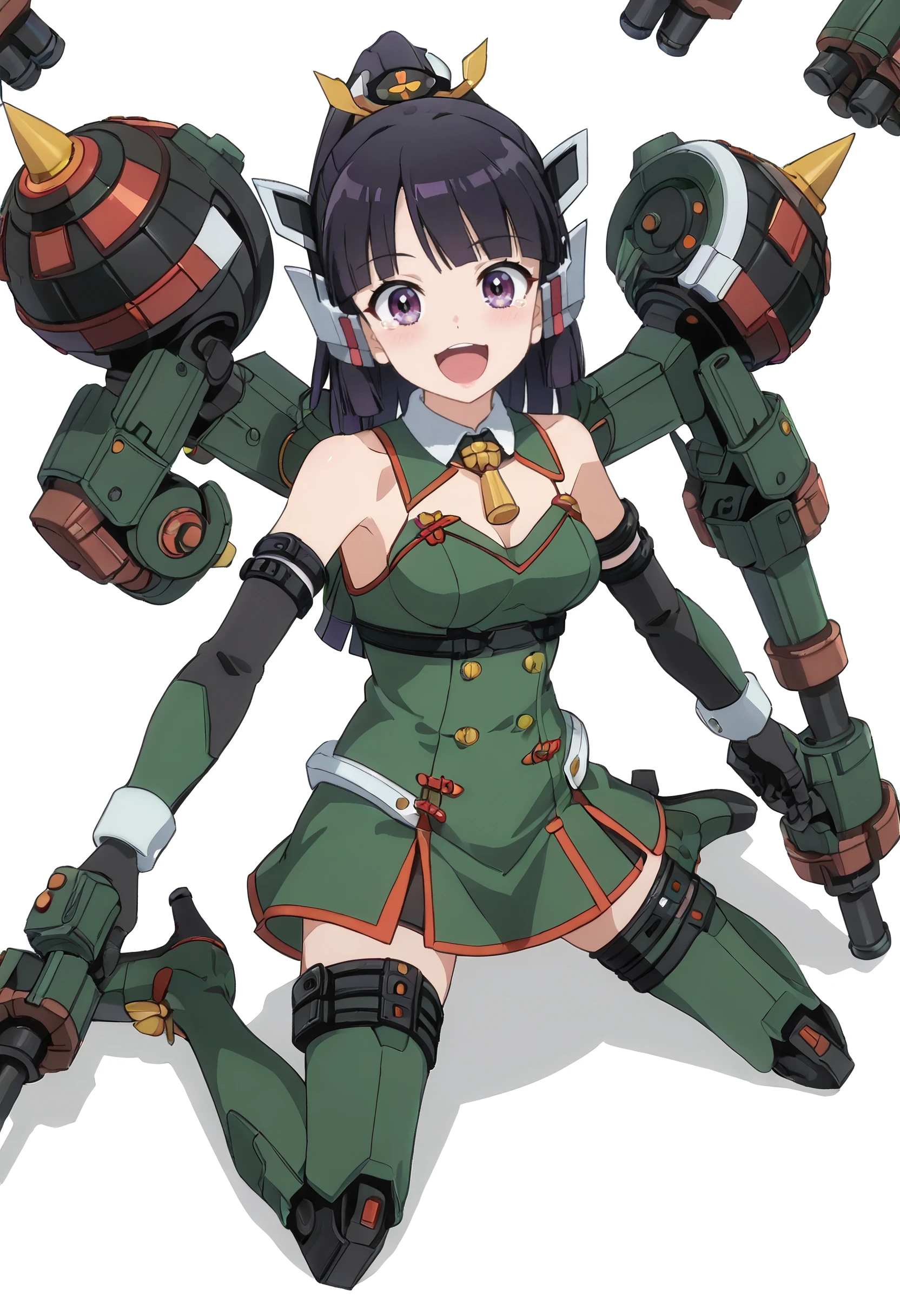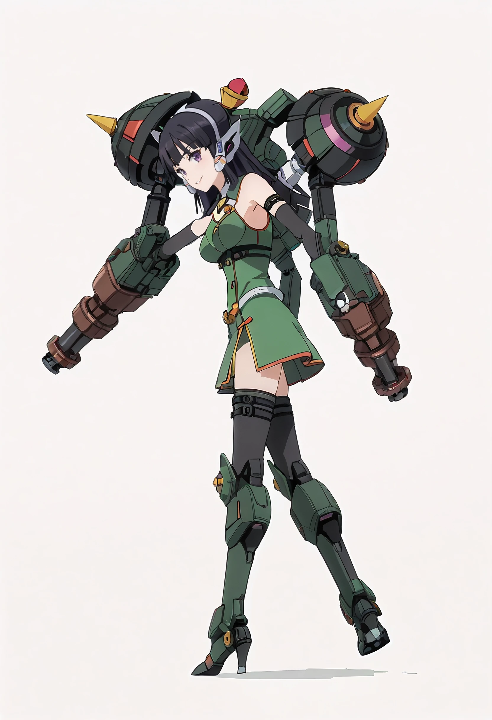 cannon, machinery, bare shoulders, elbow gloves, gloves, mecha musume, gun, mecha, weapon, boots, green legwear, headgear, thighhighs, armor, sleeveless, skirt, green skirt, green shirt,