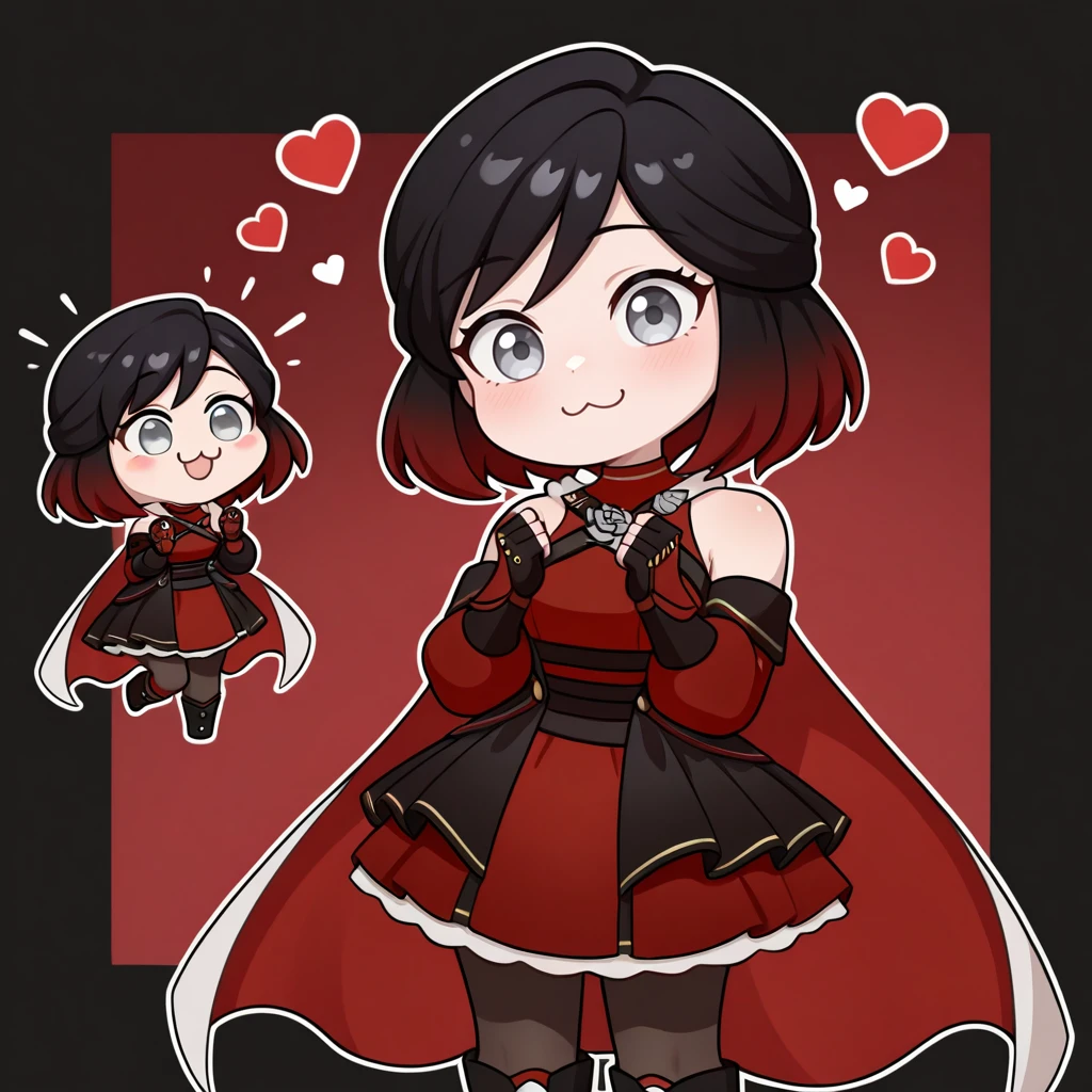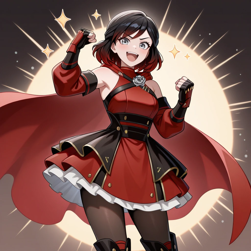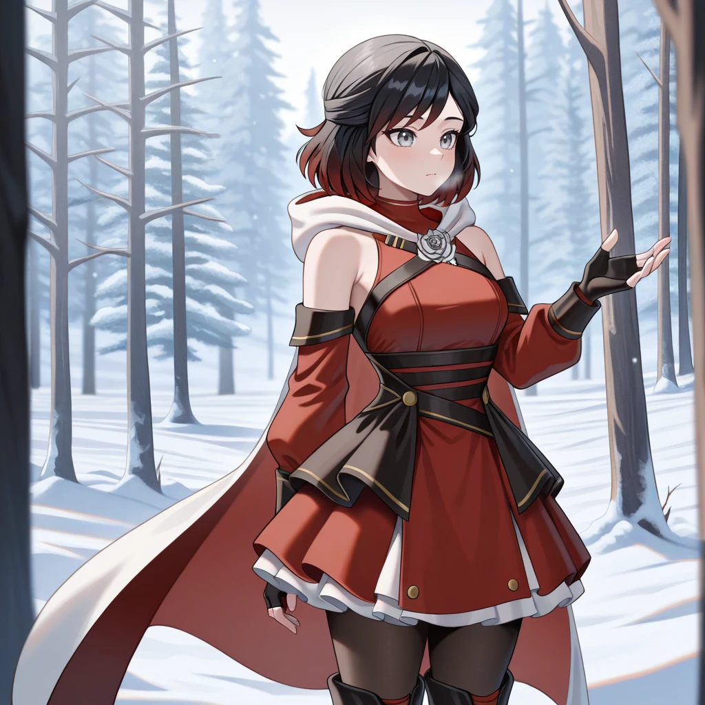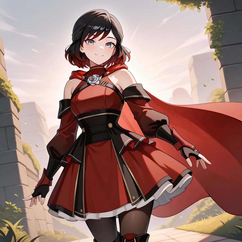 short hair, black hair,gradient hair, grey eyes, fingerless gloves, detached sleeves, bare shoulders, red dress,pantyhose, red cape, boots