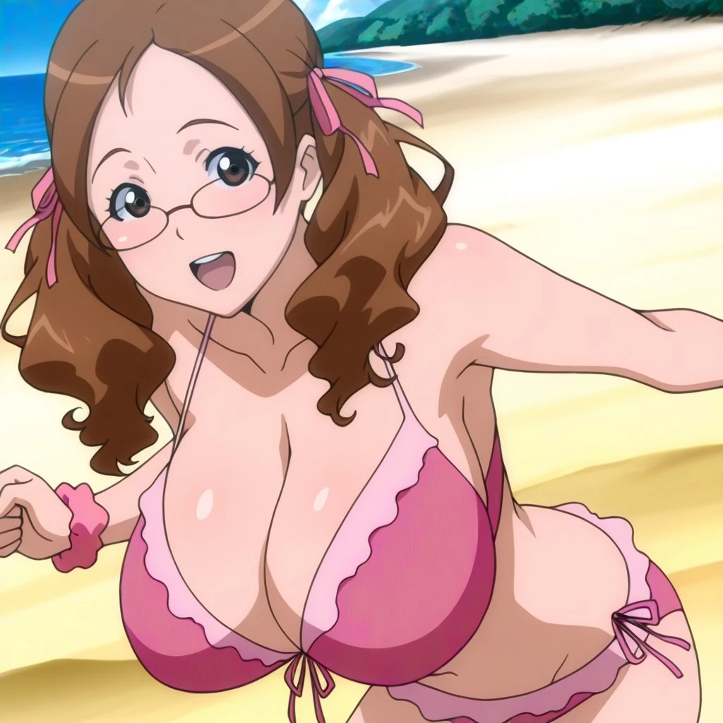 nanakowb, slim female with wavy brown hair, brown eyes, twin tails with pink ribbons, , glasses, , pink , pink wrist scrunchie
