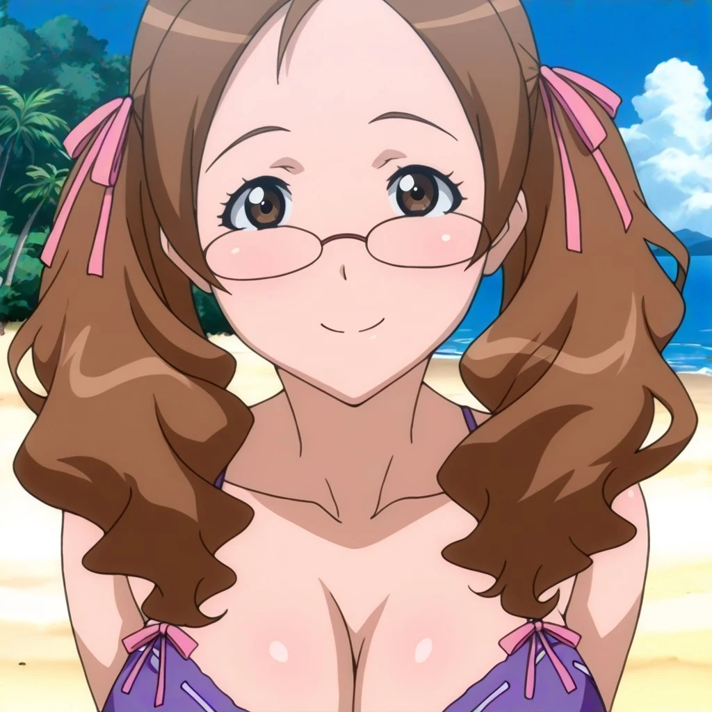 nanakowb, slim female with wavy brown hair, brown eyes, twin tails with pink ribbons, , glasses, choker, purple dress, shoulders, cleavage, purple thighhighs