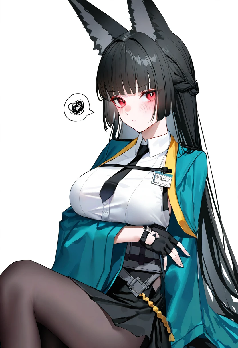 1girl,hoshimi miyabi,solo,single glove,white shirt,black pantyhose,red nails,black skirt,collared shirt,black necktie,black footwear,blunt bangs,black gloves,pleated skirt,braid,green jacket,