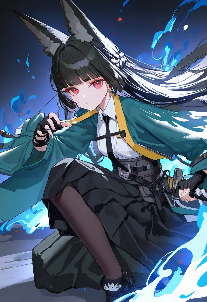 1girl,hoshimi miyabi,solo,single glove,white shirt,black pantyhose,red nails,black skirt,collared shirt,black necktie,black footwear,blunt bangs,black gloves,pleated skirt,braid,green jacket,如果你喜欢我的lora,欢迎来我的爱发电支持我,也可以定制角色/画风lora。闲鱼同名Wenaka_,多平台同名
