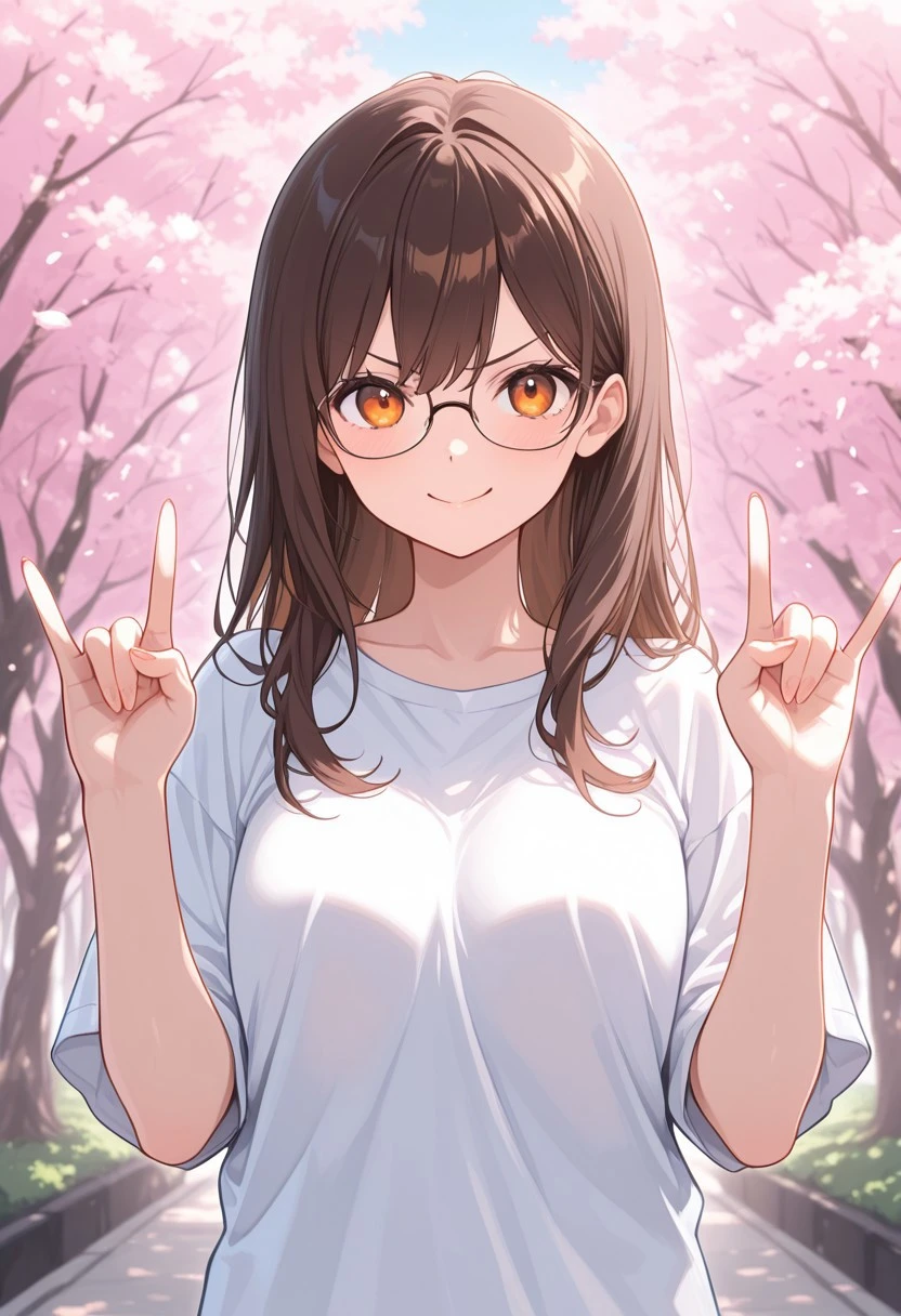 solo, 1girl, upper body, bangs, glasses, orange eyes, brown hair, white t-shirt, double_rnrolling_out, hands up, >:), looking at viewer, outdoor, cherry blossom, masterpiece, 4k resolutionㅤ