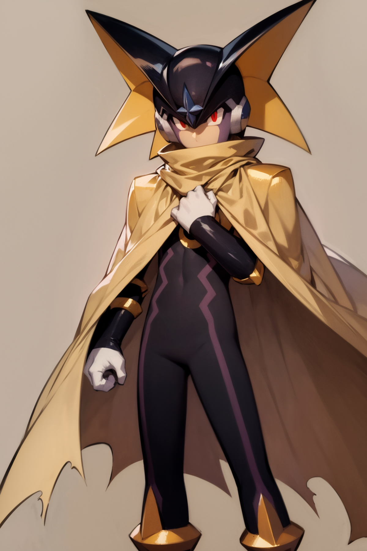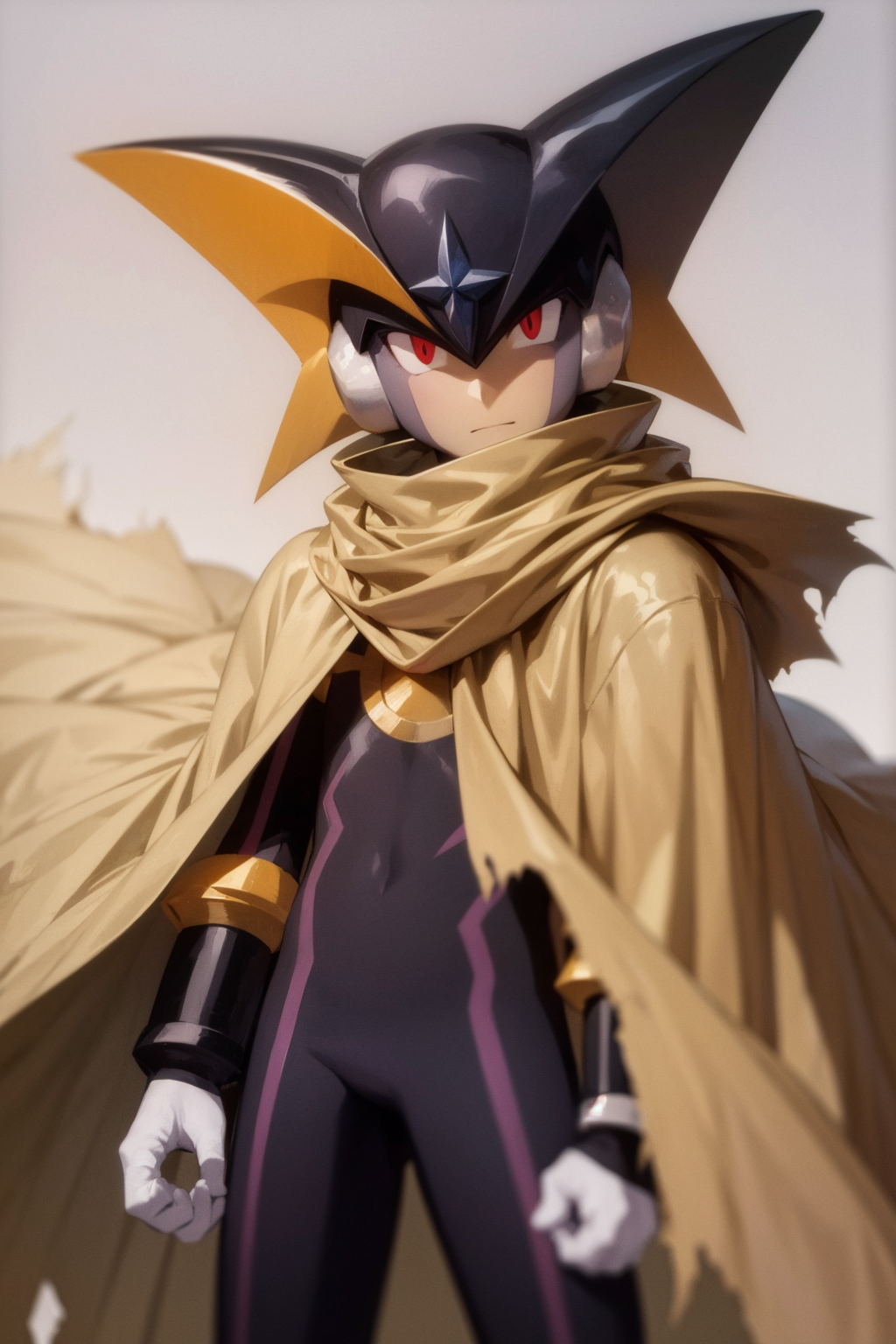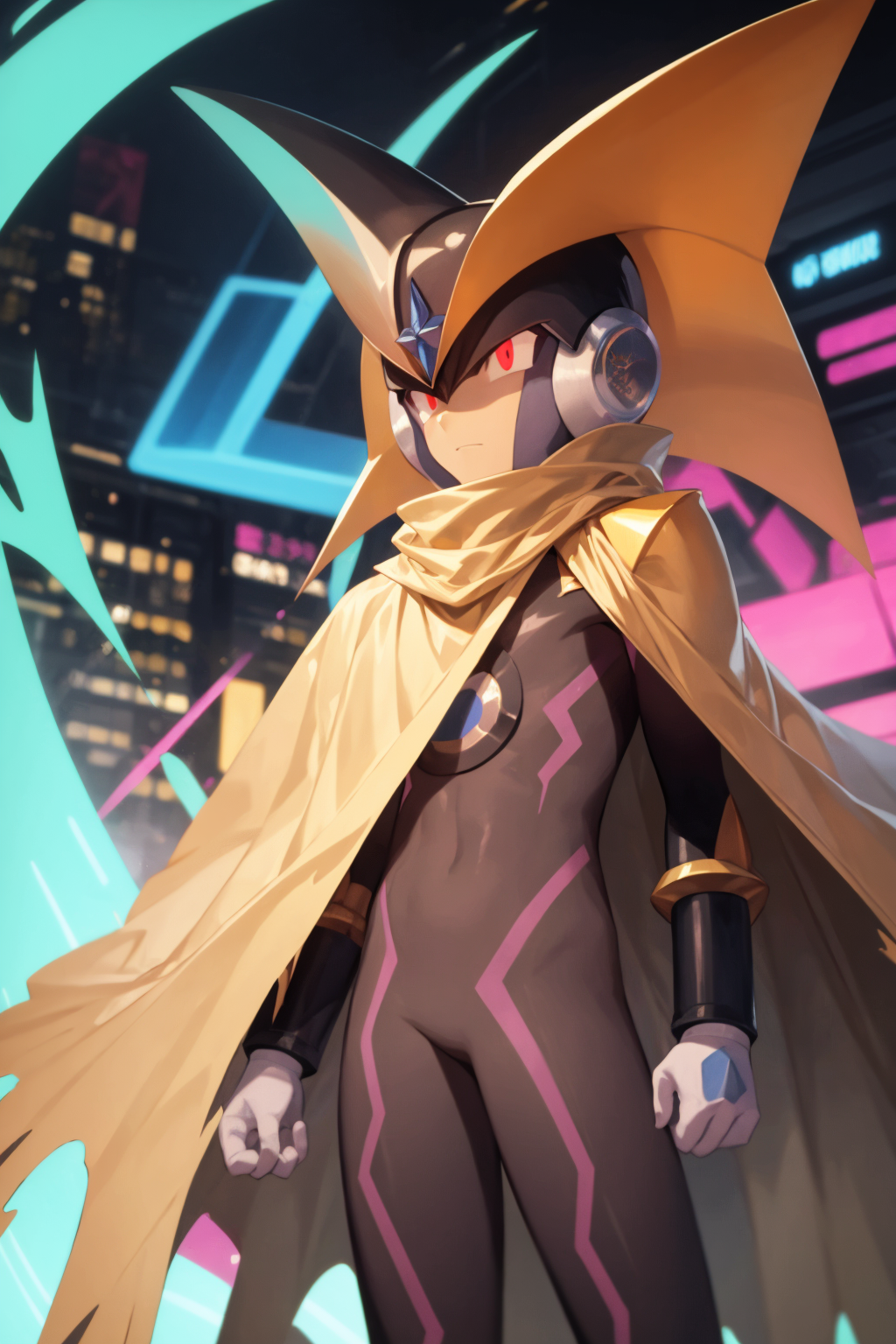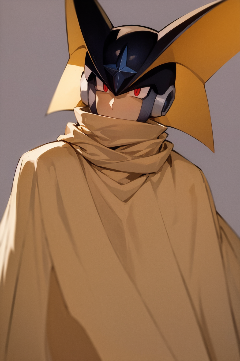 Other prompts : 1boy, helmet, red eyes, cape, torn clothes, armor, gloves, android, cloak, bodysuit