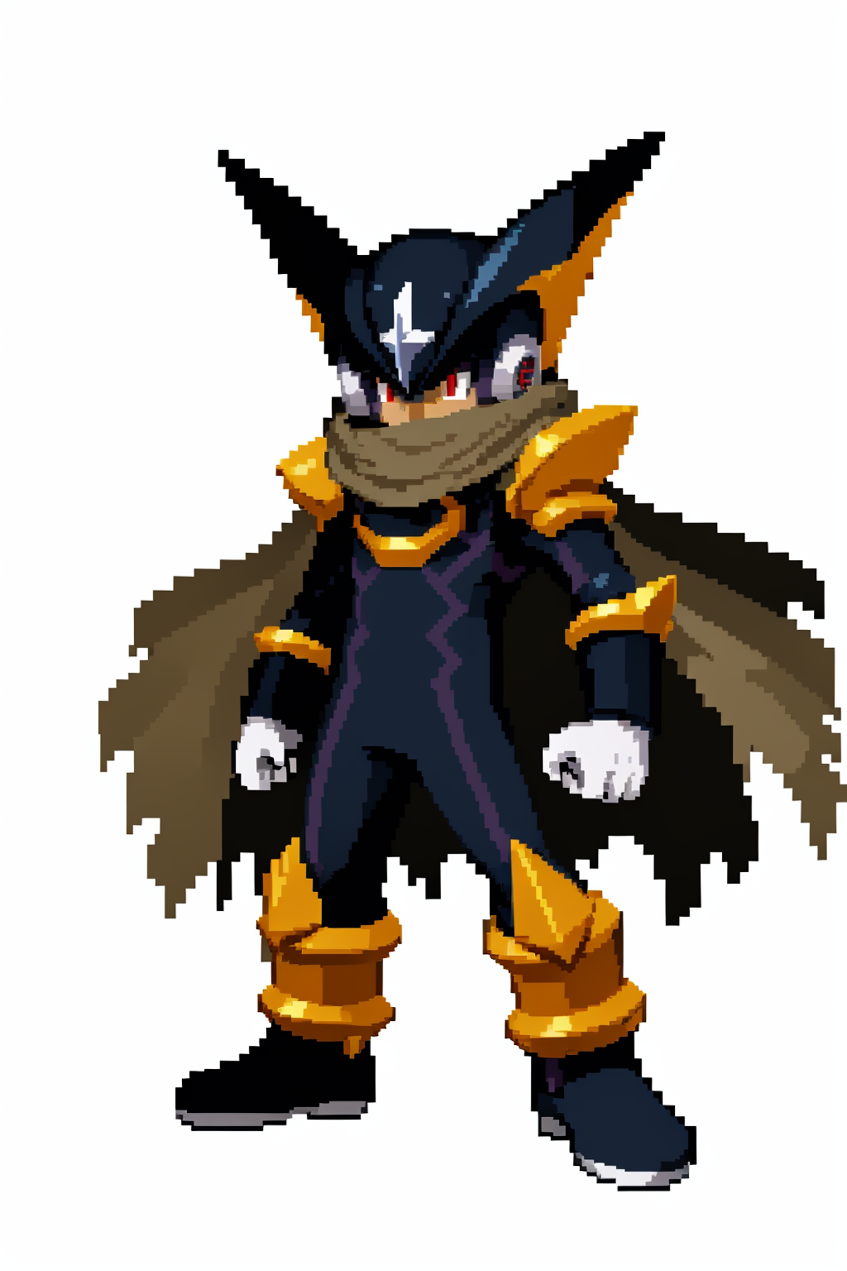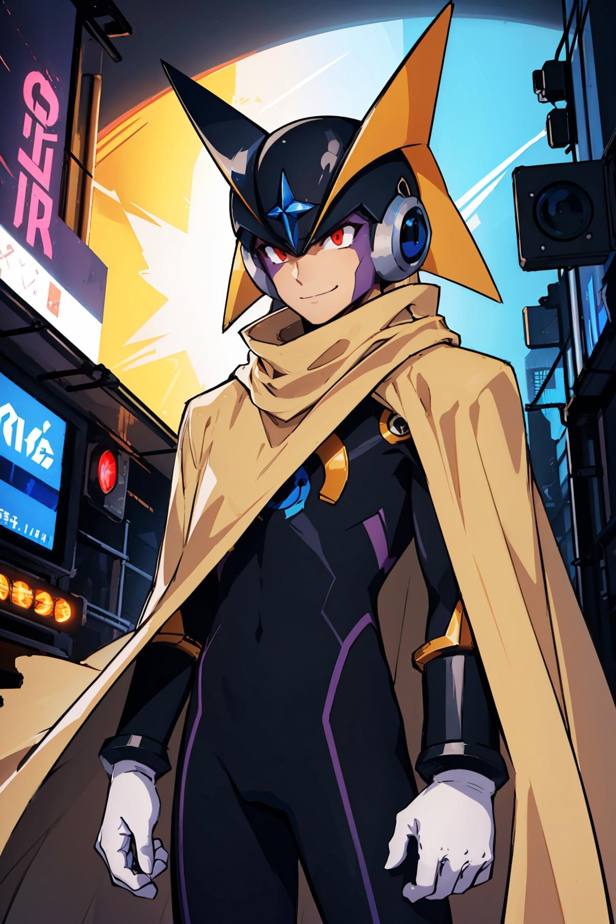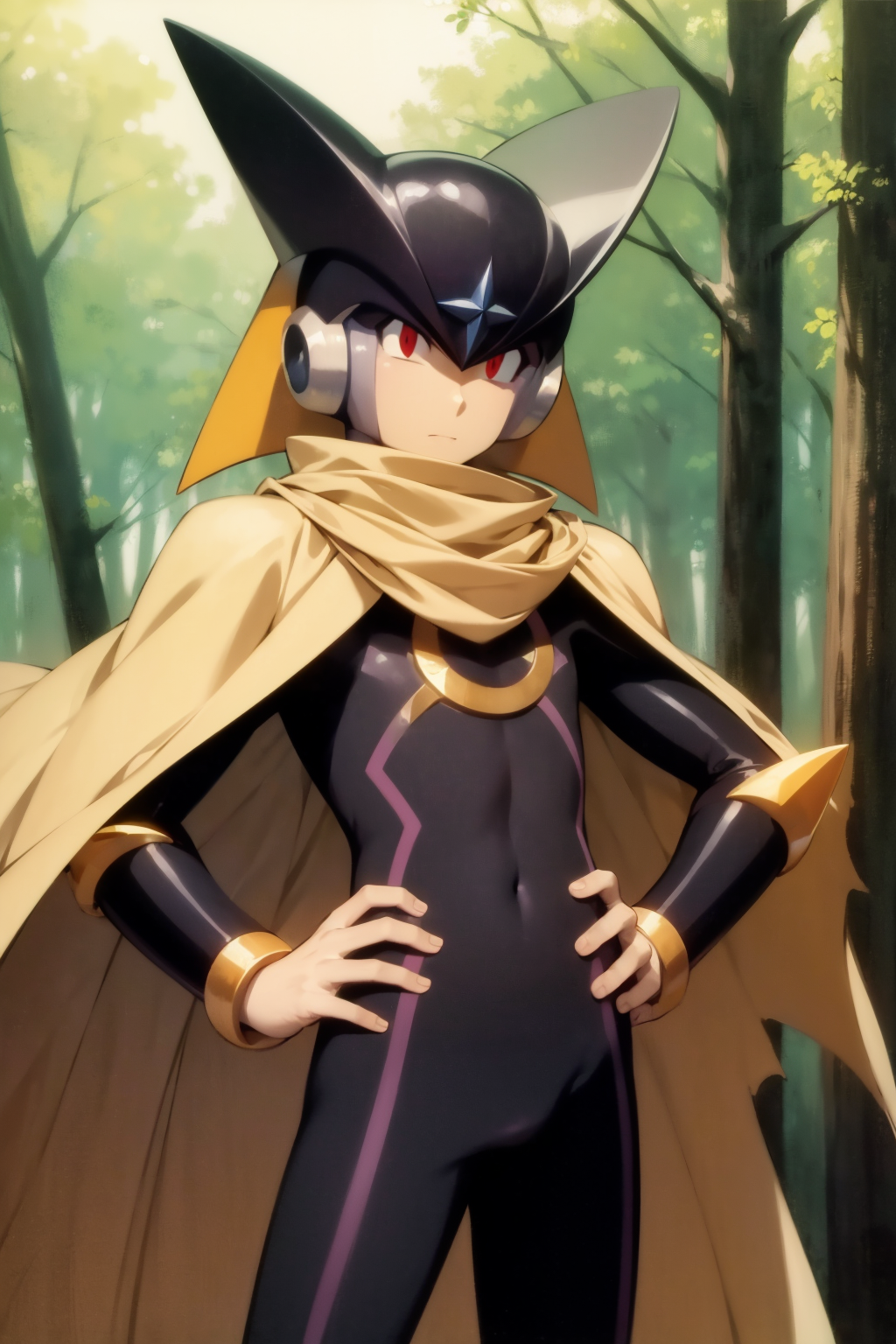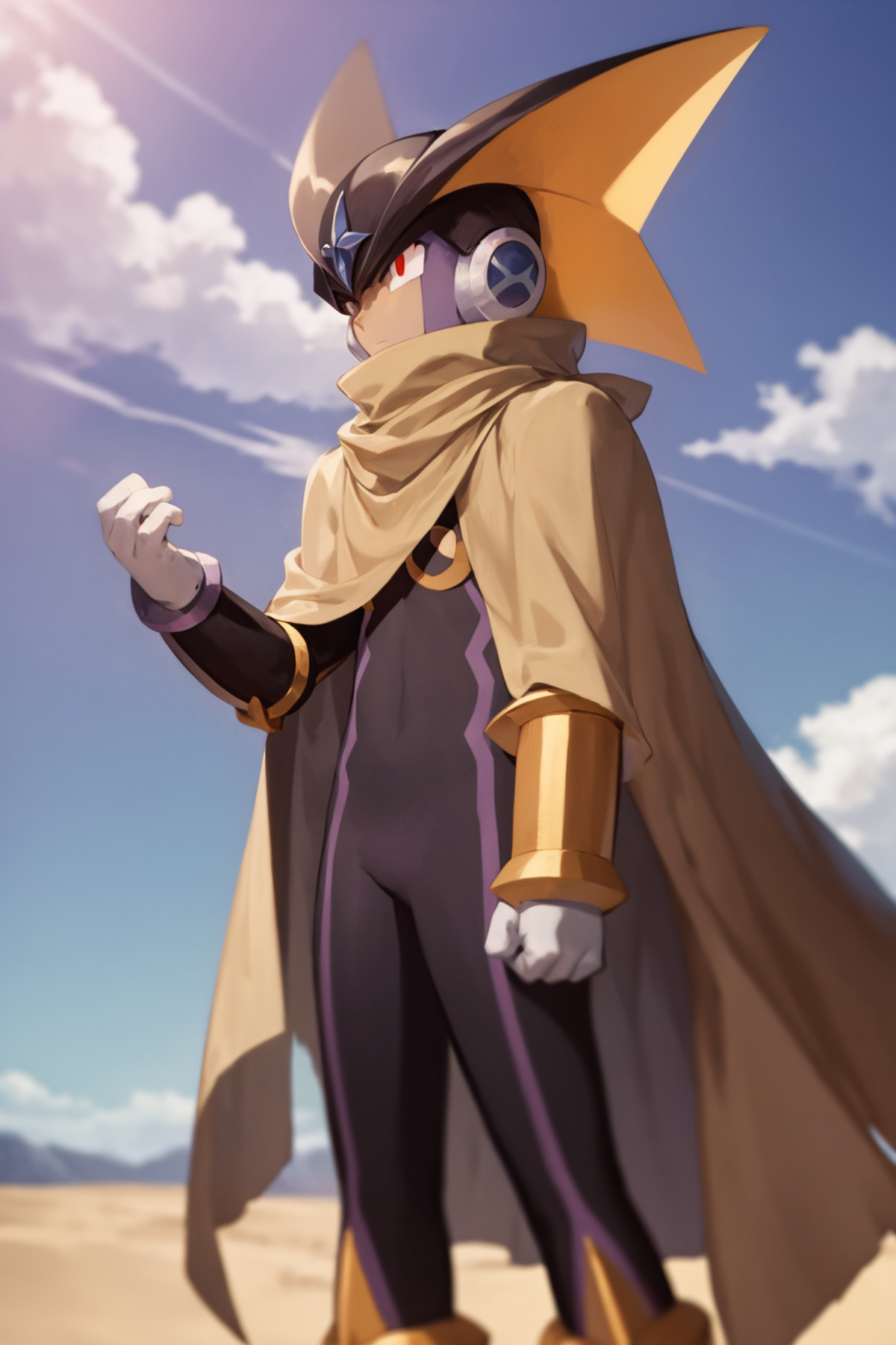 Other prompts : 1boy, helmet, red eyes, cape, torn clothes, armor, gloves, android, cloak, bodysuit
