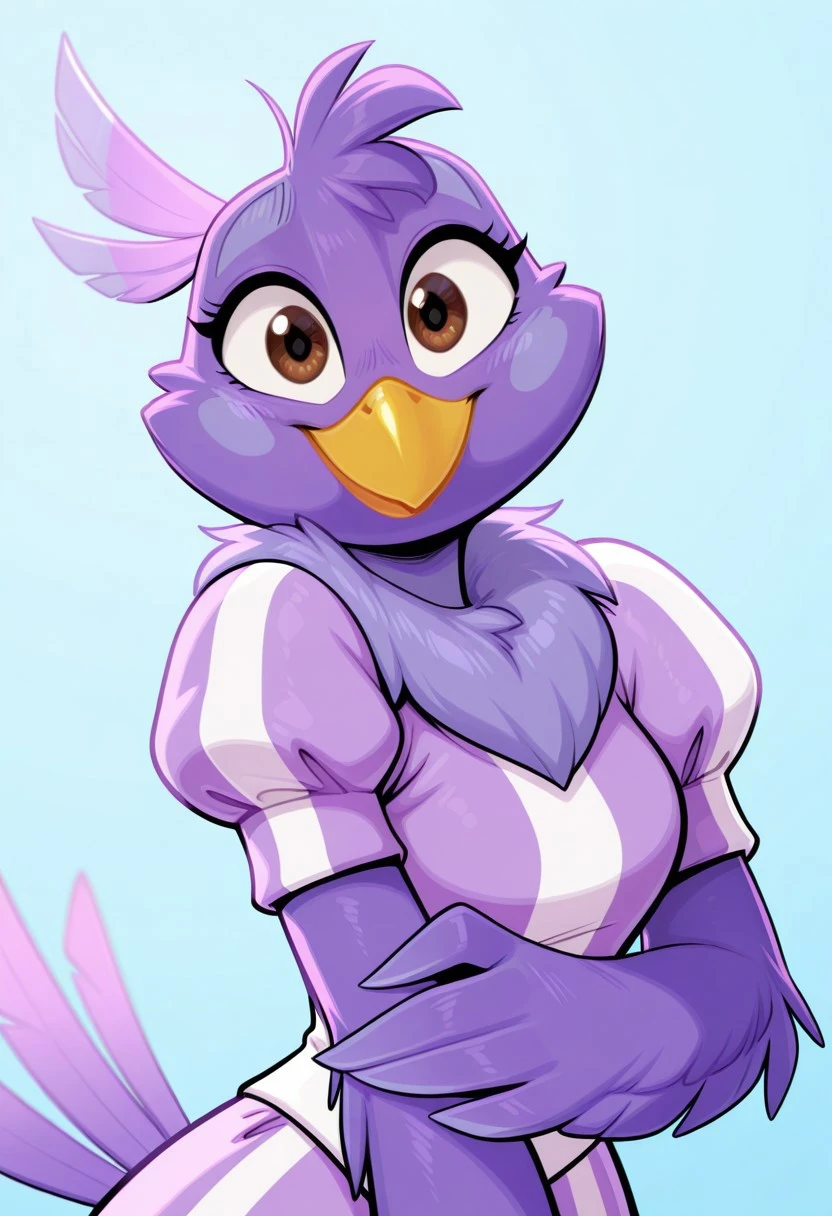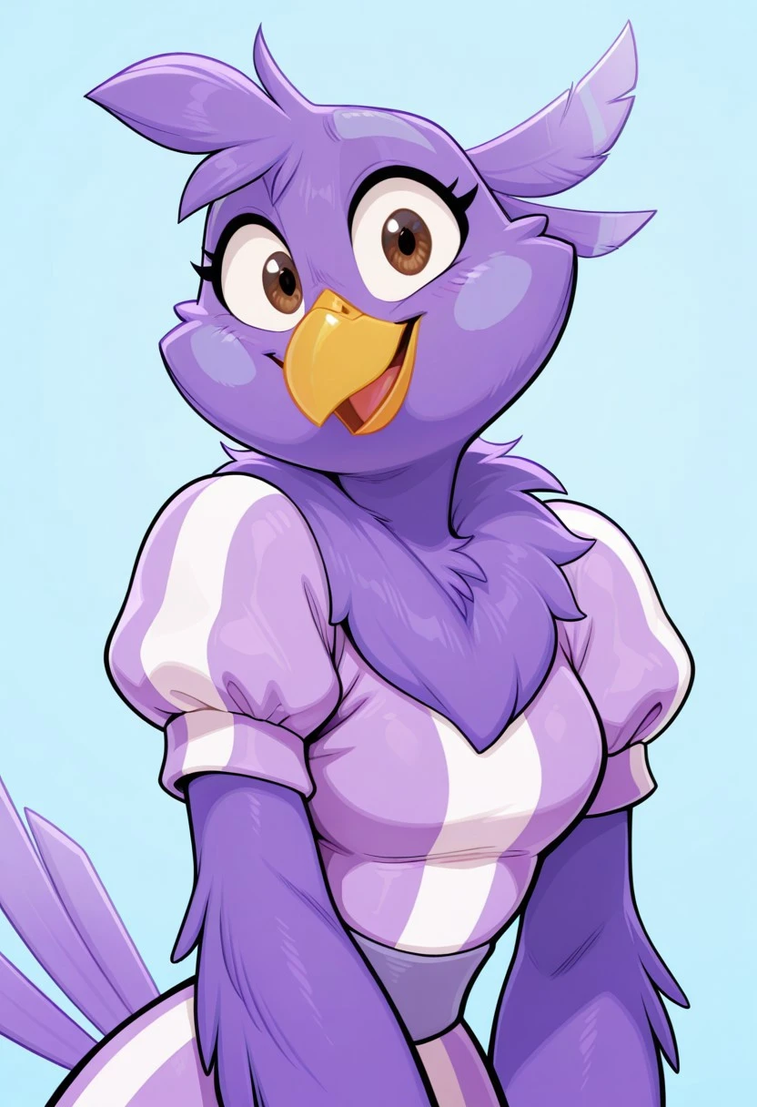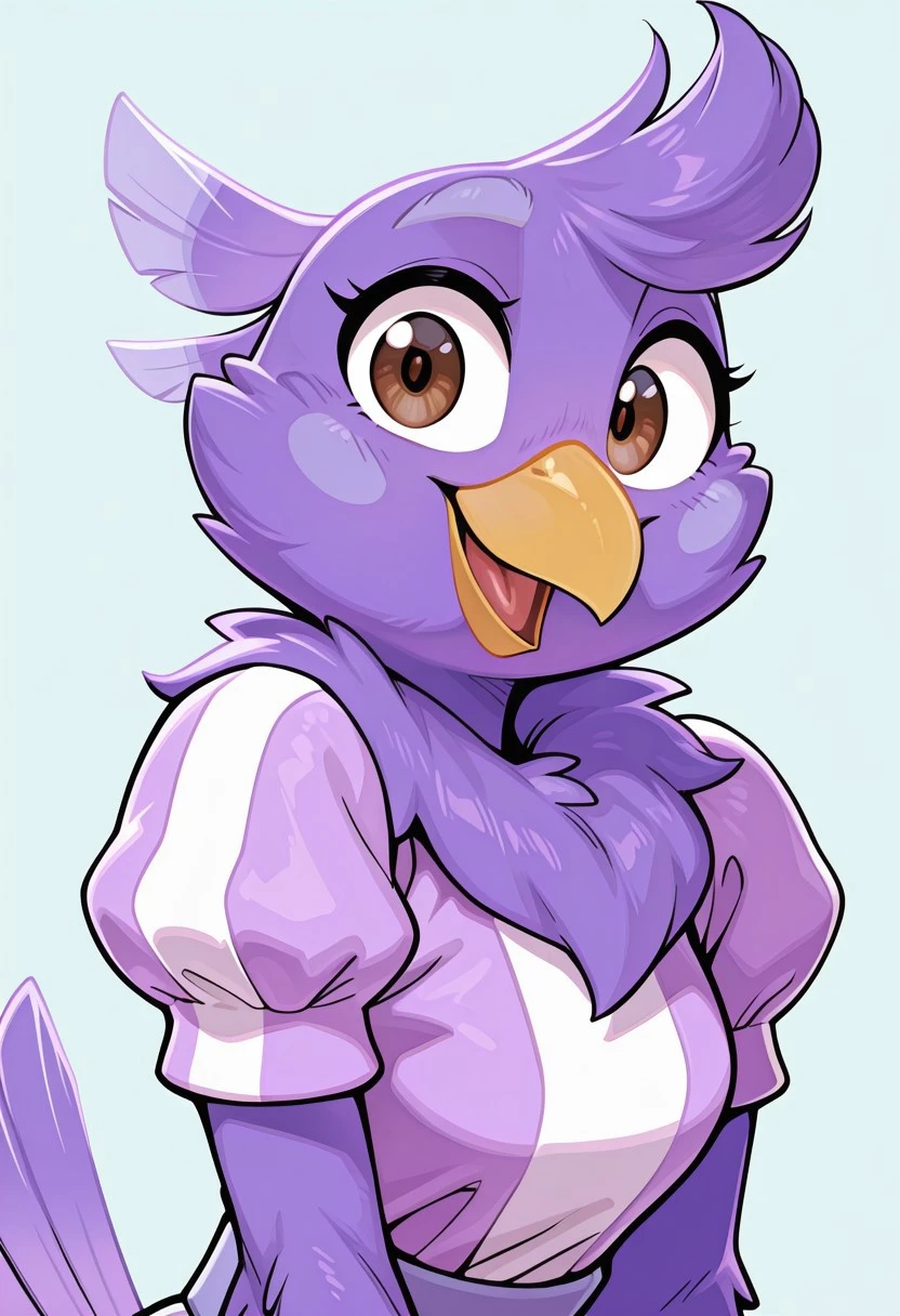 furry female, avian, bird girl, purple feathers, beak, brown eyes