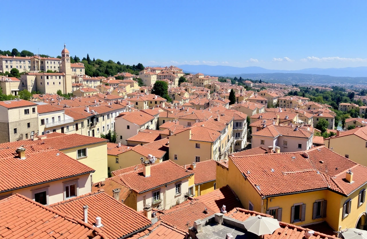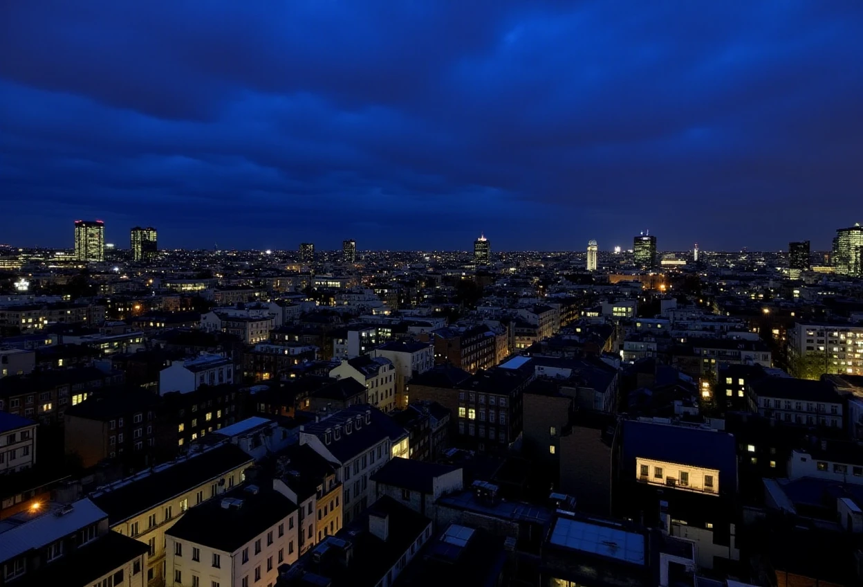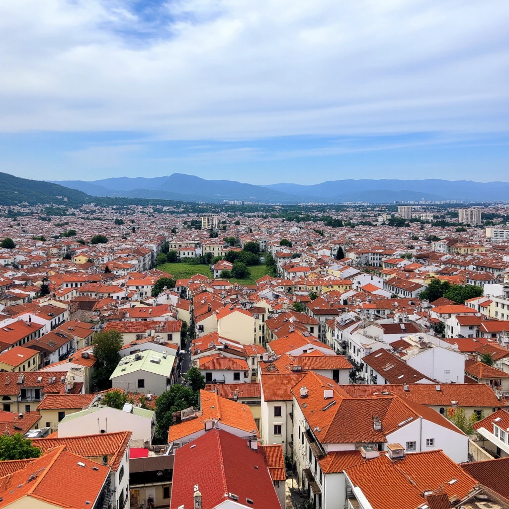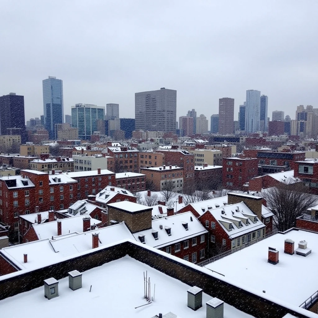 The end part, 'taken from a nearby rooftop', reliably brings the image down from a fairly distant aerial panorama to a more immediate urban sprawl. You can experiment with all sorts of view-related ideas though.