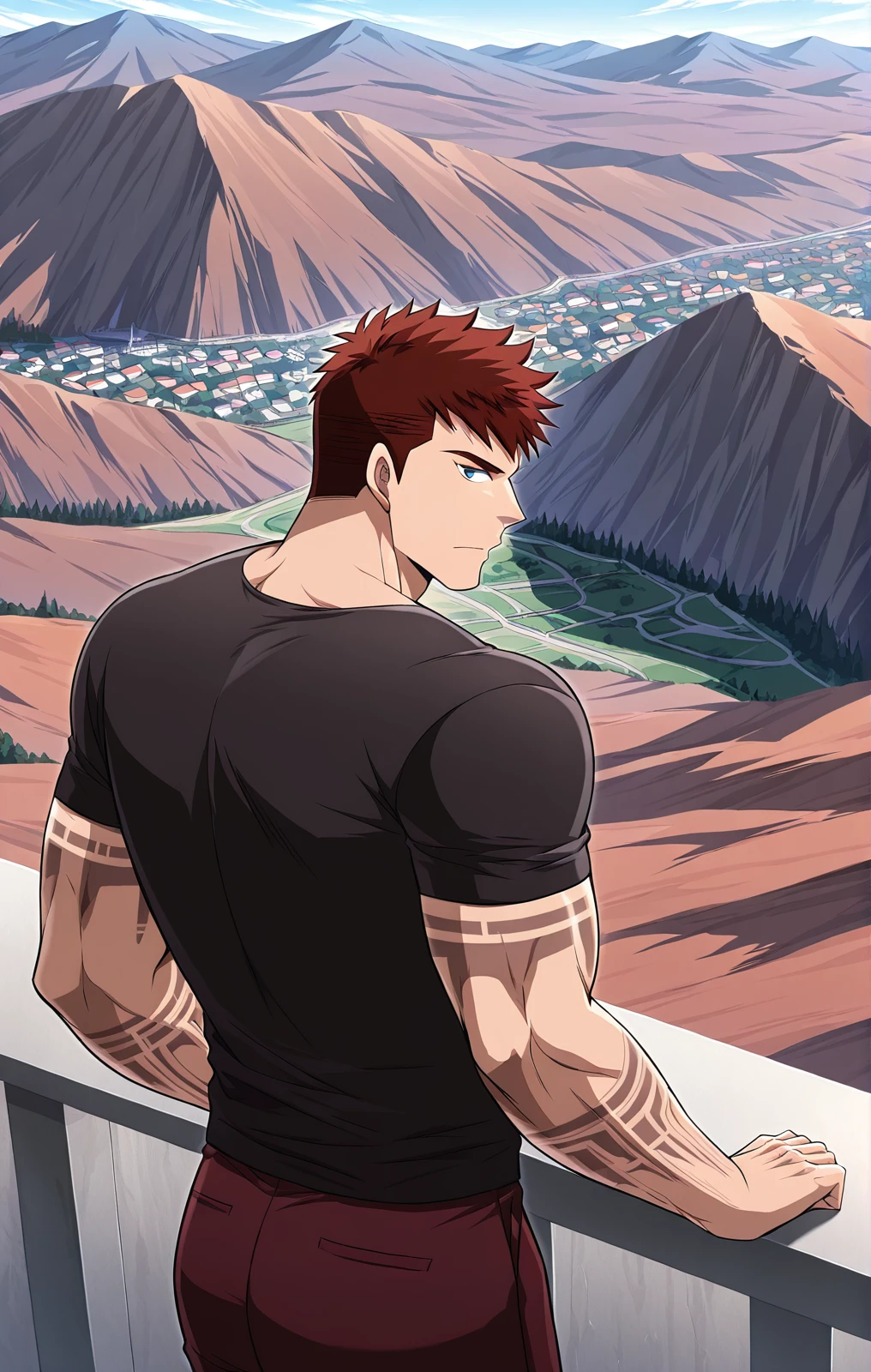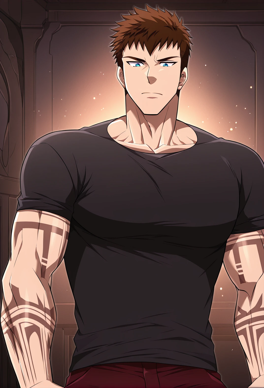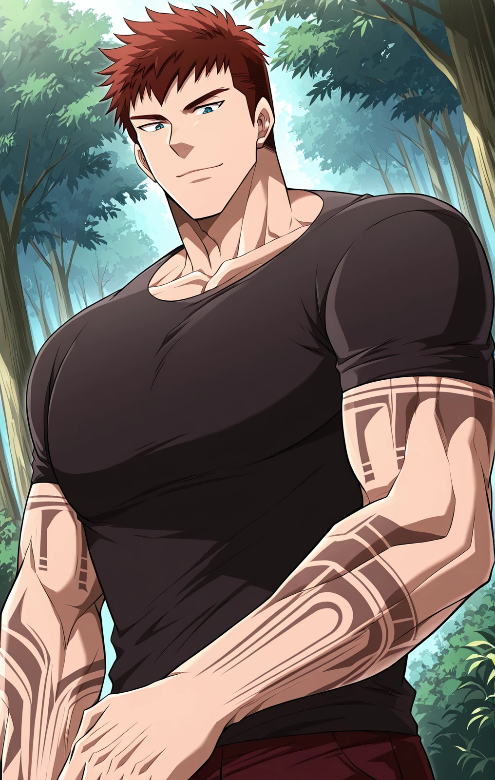 Bjorn_outfit, black t-shirt, tight shirt, rolled sleeves, maroon pants,