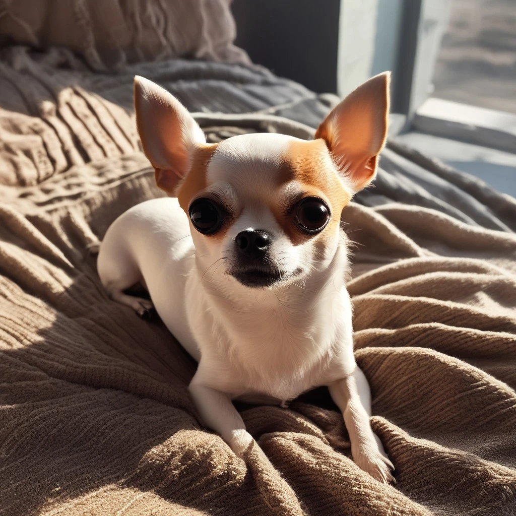 a photo of chihuahua mika laying on a blanket, natural lightingrealistic portrait of chihuahua mika, close-up, 4kcartoon style chihuahua mika wearing sunglasses