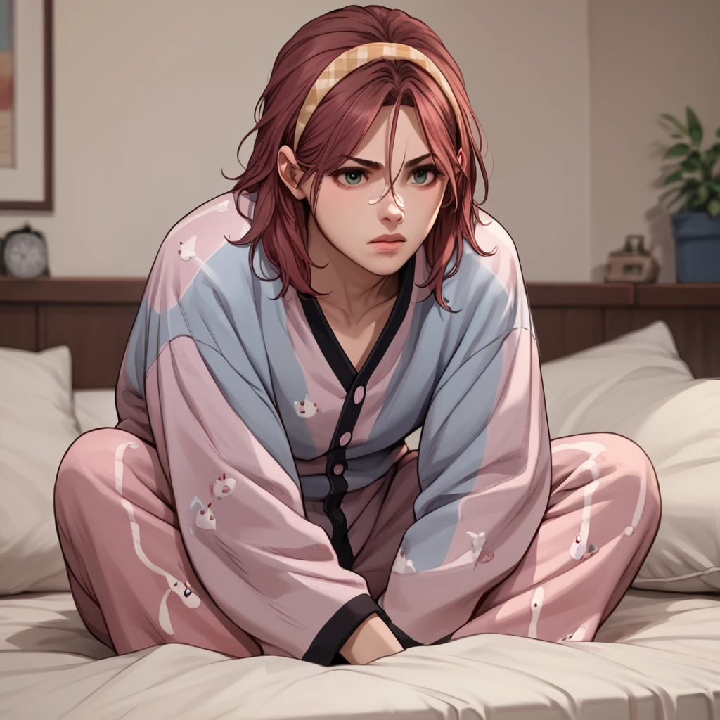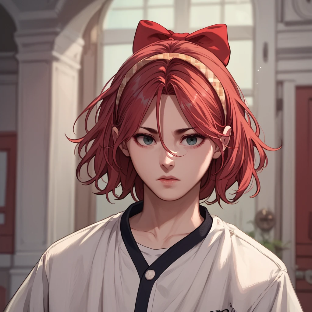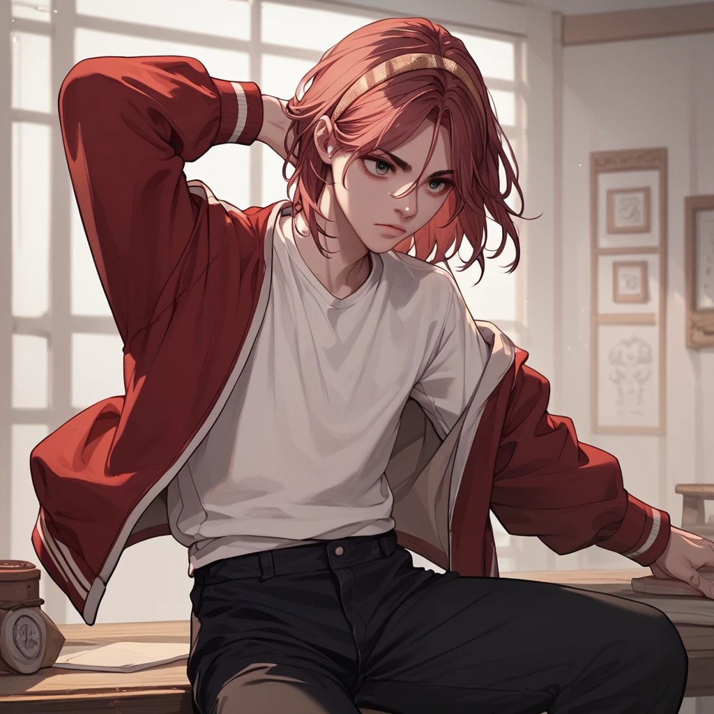 recognizable tags: long hair, medium hair, long sleeves, skirt, jacket, red jacket, white hacket, pants, black pants, jacket, red jacket, skirt, black skirt, pleated skirt, thighhigs, black thighigs, bangs,