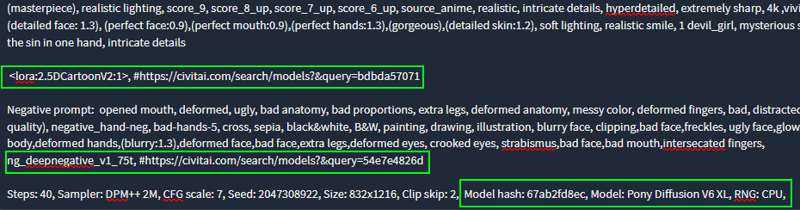 Let's take for example: https://civitai.com/images/8010475 (and leave a thumbs up, while you're there). If you'd save it and drop it into the prompt area, you can see, it has the following info...