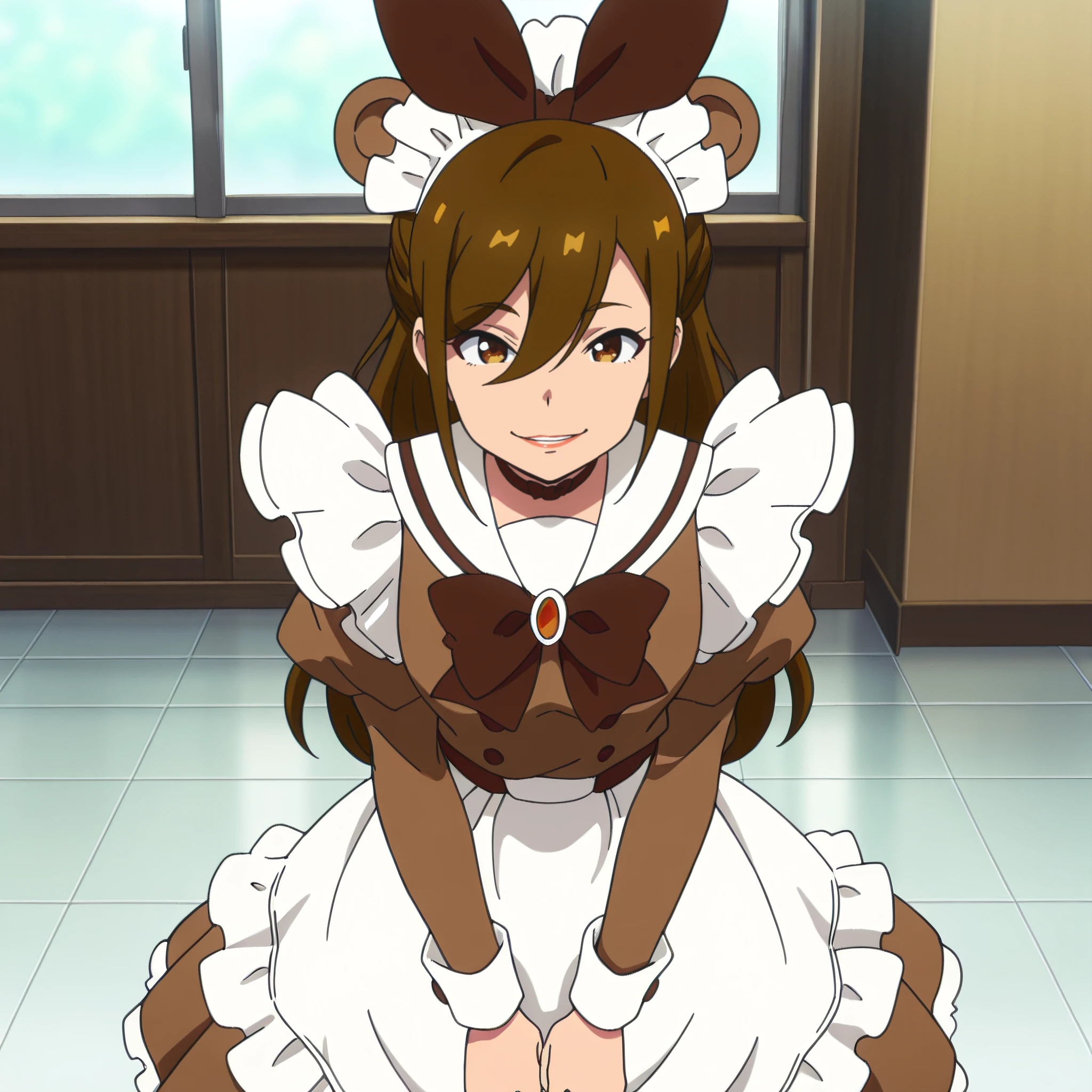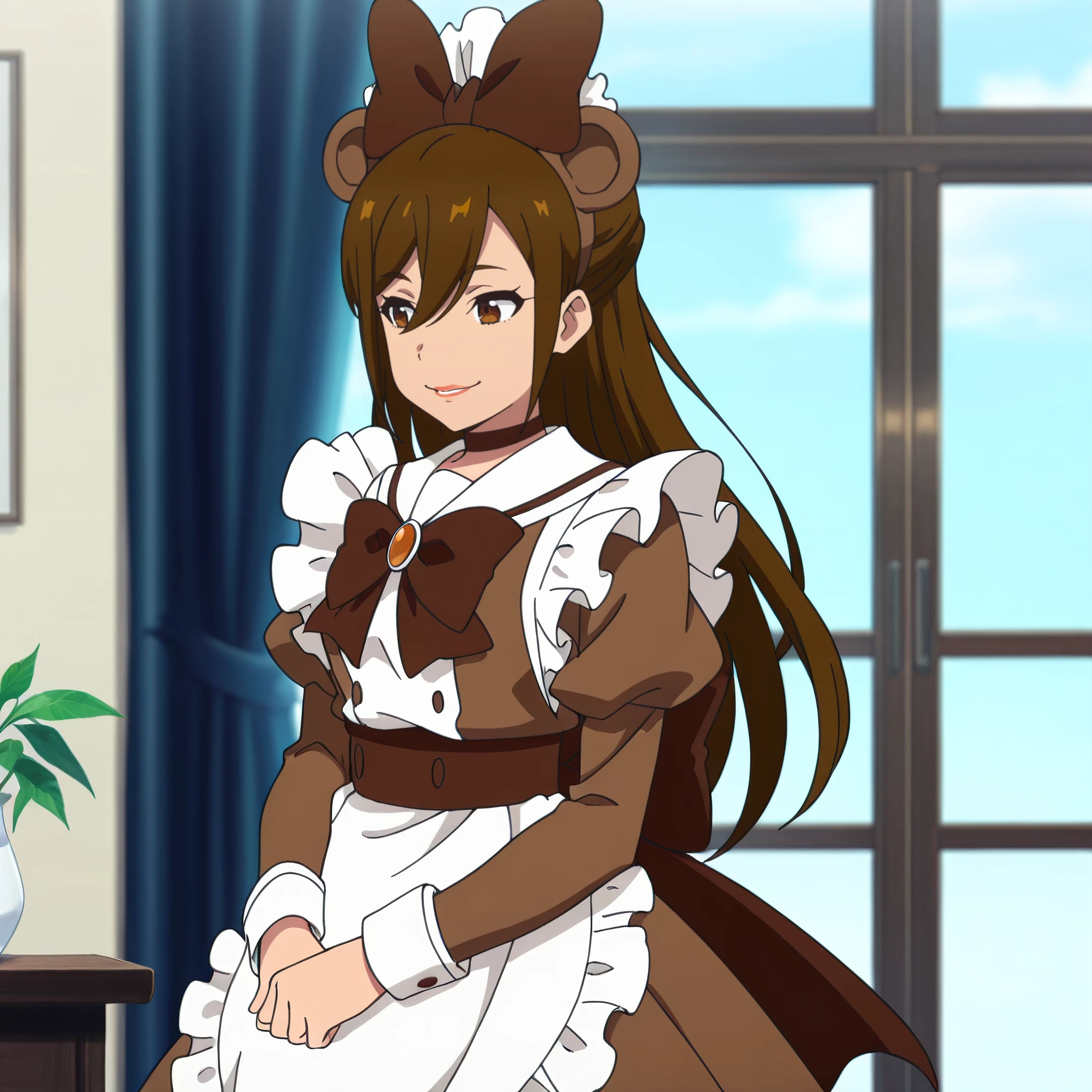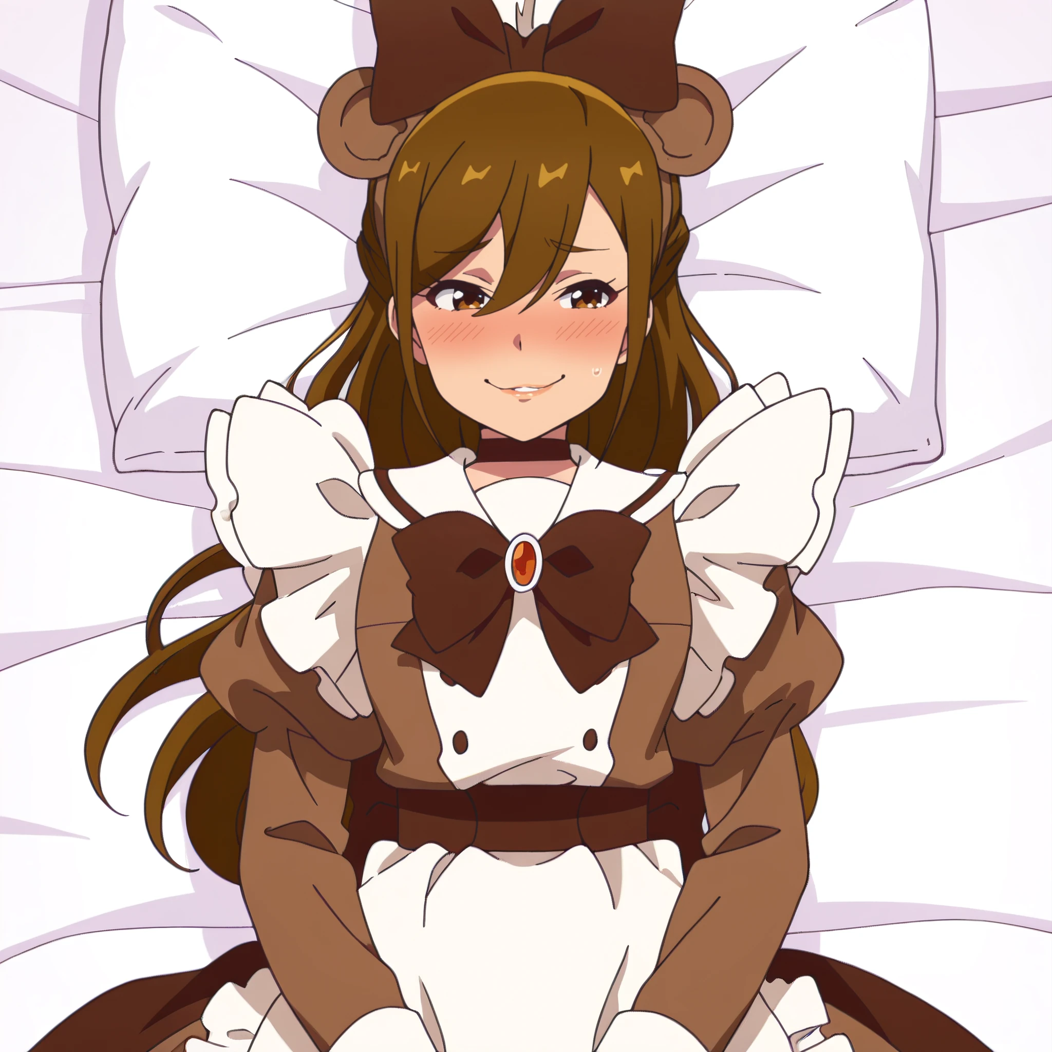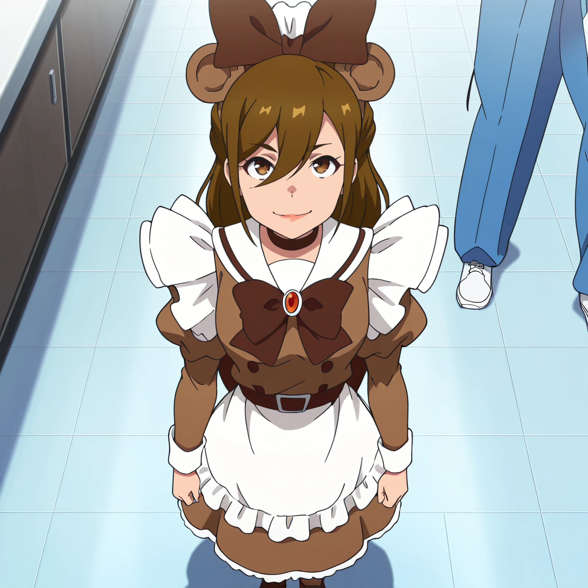 AMWBearExecutive, bow, brown hair, brown bow, brown eyes, hair bow, long hair, bowtie, ribbon, hair between eyes, brown bowtie, animal ears, red ribbon,