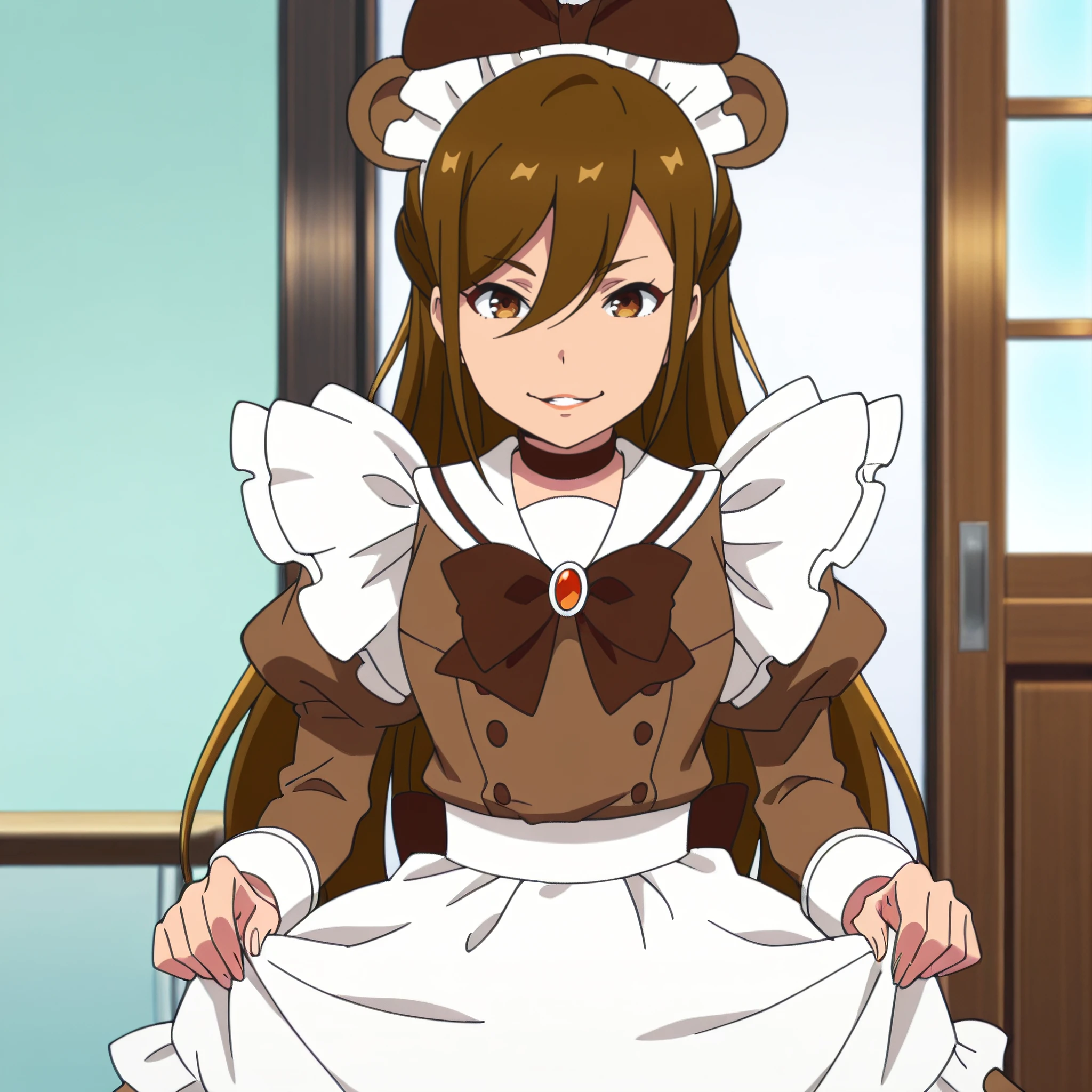 brown dress, frills, apron, long sleeves, choker, maid apron, maid, maid headdress,