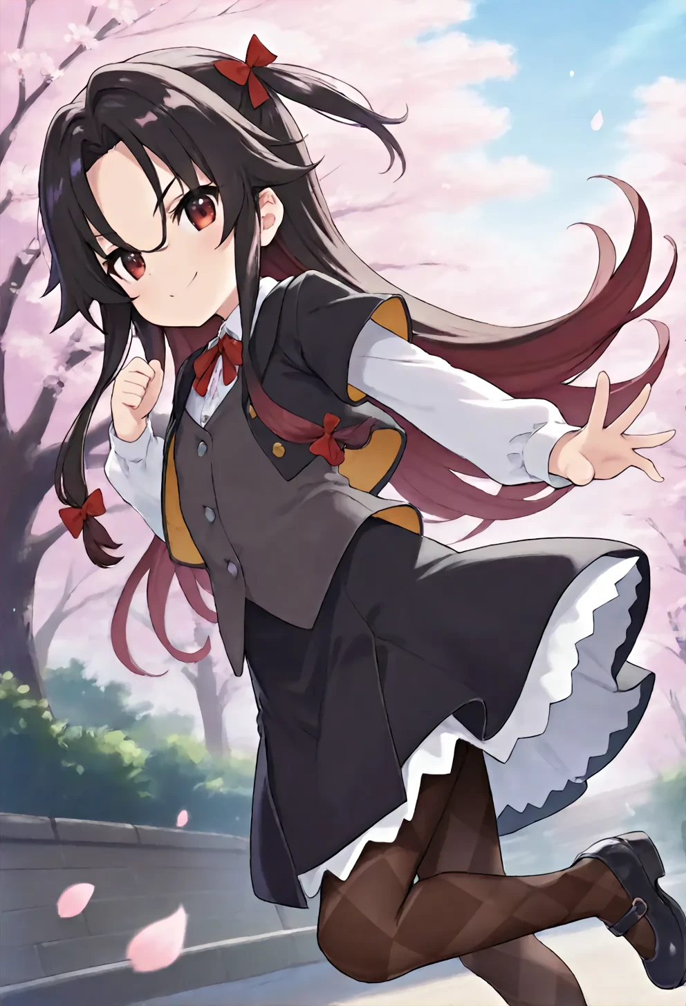 ai-default,yashajin ai,red eyes,black hair,long hair,sidelocks,one side up,black jacket,white collared shirt,short over long sleeves,grey vest,black skirt,frilled skirt,argyle pantyhose,mary janes