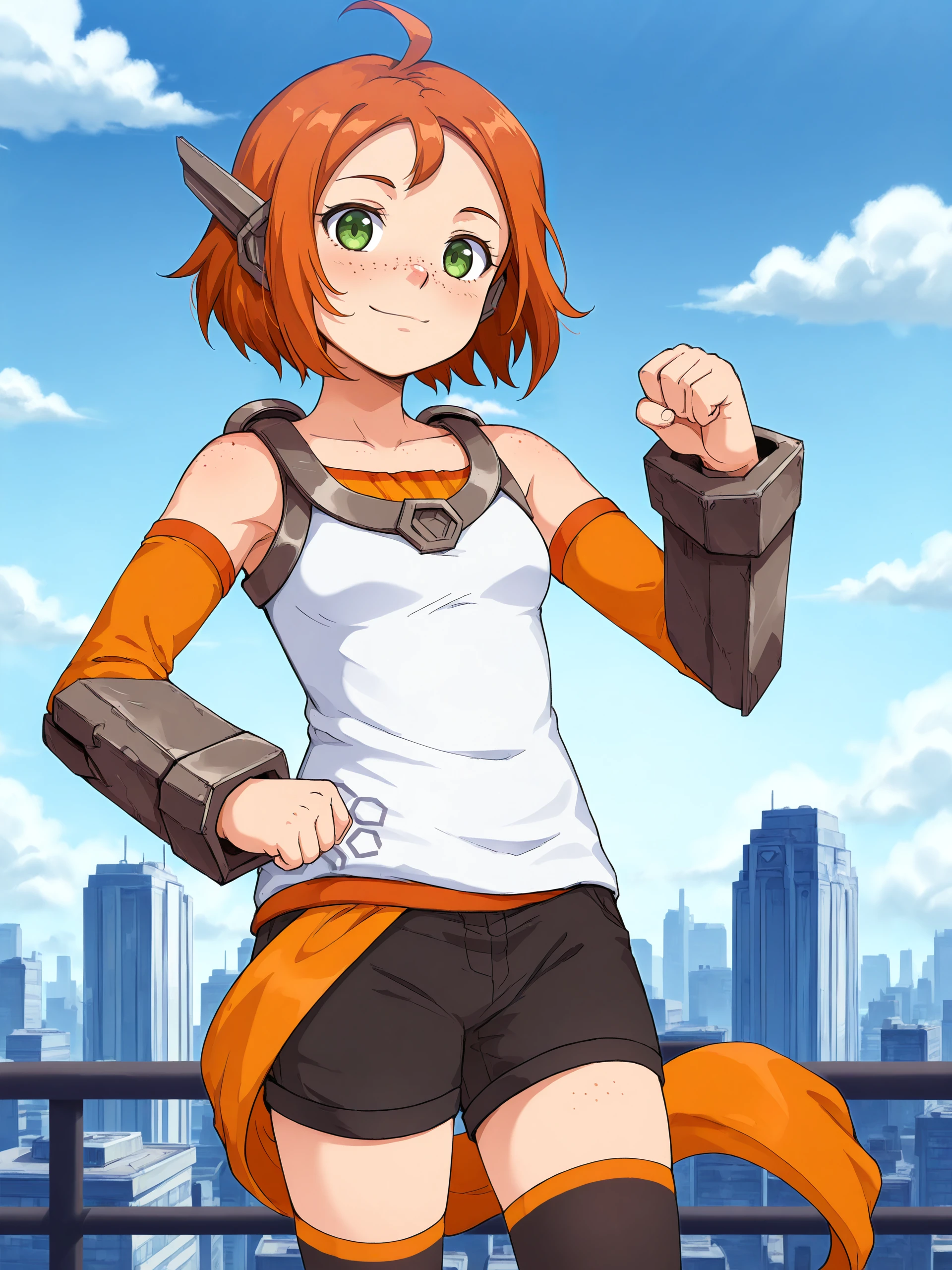 emilieDef, freckles, small breasts, ahoge, headgear, tank top, harness, orange arm warmers, vambraces, black shorts, waist sash, black thighhighs, black footwear